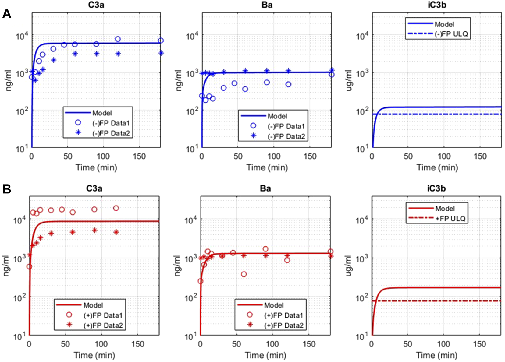 Comparison of model simulations with GSK in vitro assay data for alternative pathway. Model results are denoted by solid line, and the assay results are from two sets of independent, identical experiments, denoted as “Data 1” (o) and “Data 2” (*). (A) Model simulation and in vitro data for alternative pathway assay without Properdin (−) FP for C3a, Ba, iC3b. (B) Model simulation and in vitro data for alternative pathway assay with Properdin (+)FP for C3a, Ba, and iC3b.