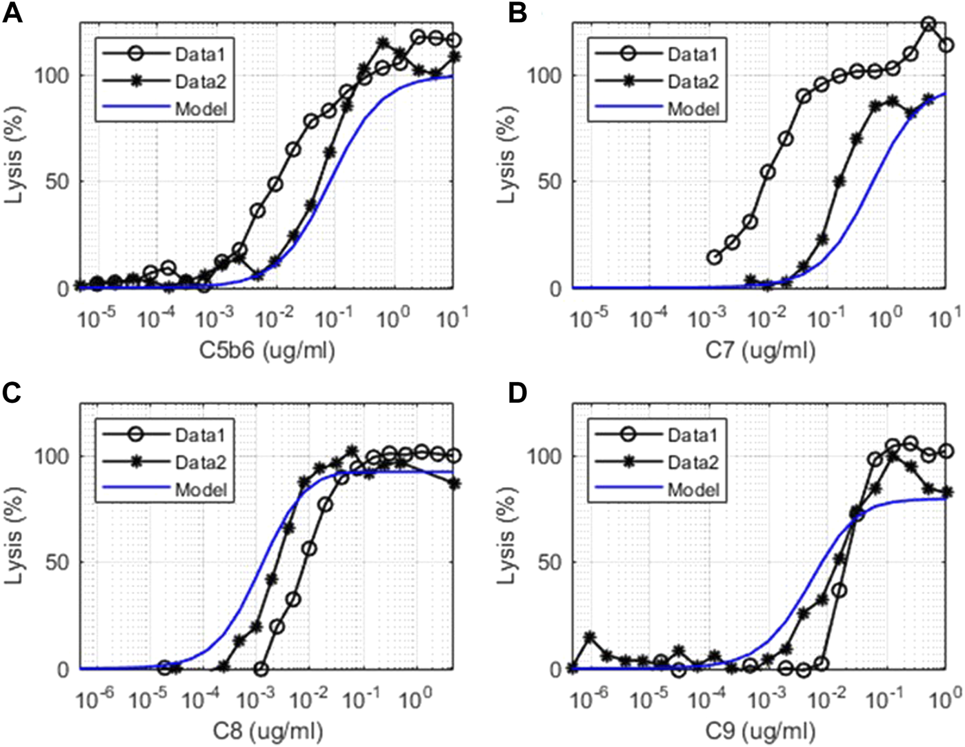 Comparison of model simulations with in vitro assay data for terminal pathways. Model simulation results are denoted by solid blue line, and the terminal pathway assay results are from two sets of independent, identical experiments denoted as “Data 1” (o) and “Data 2” (*). Dose–response of cell lysis is shown for different concentrations of (A) C5b6 (μg/ml), (B) C7 (μg/ml), (C) C8 (μg/ml), and (D) C9 (μg/ml).