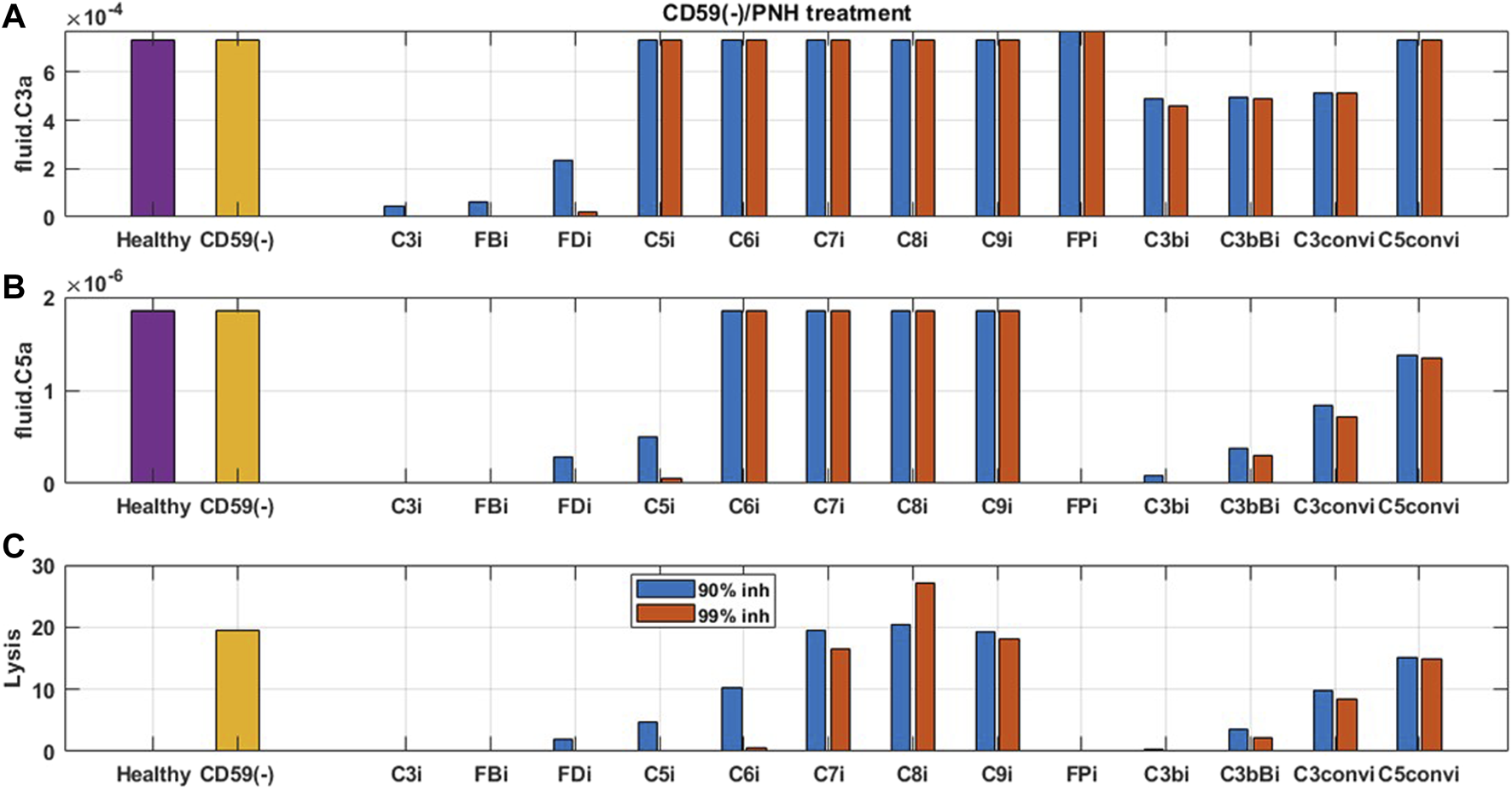 The model simulations, via reduction in FH and CD59, reflect the mechanistic basis of complement activation in diseases such as atypical hemolytic uremic syndrome (aHUS) and paroxysmal nocturnal hemoglobinuria (PNH). These fundamental representations of simulated disease states have been used for evaluating the effect of potential complement targets on reducing disease severity via downstream biomarkers (e.g., C3a, C5a, and MAC) and the lysis of erythrocytes.