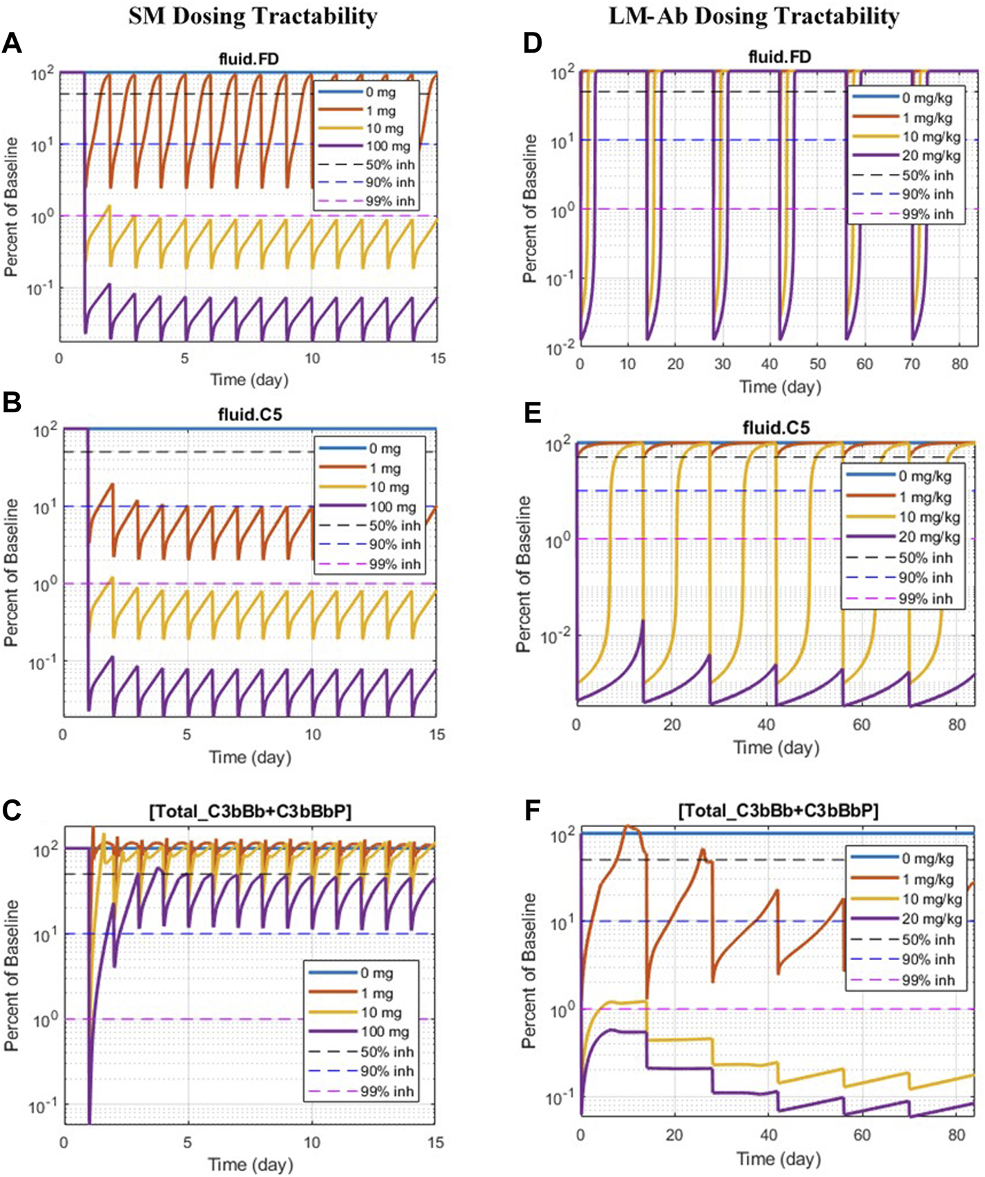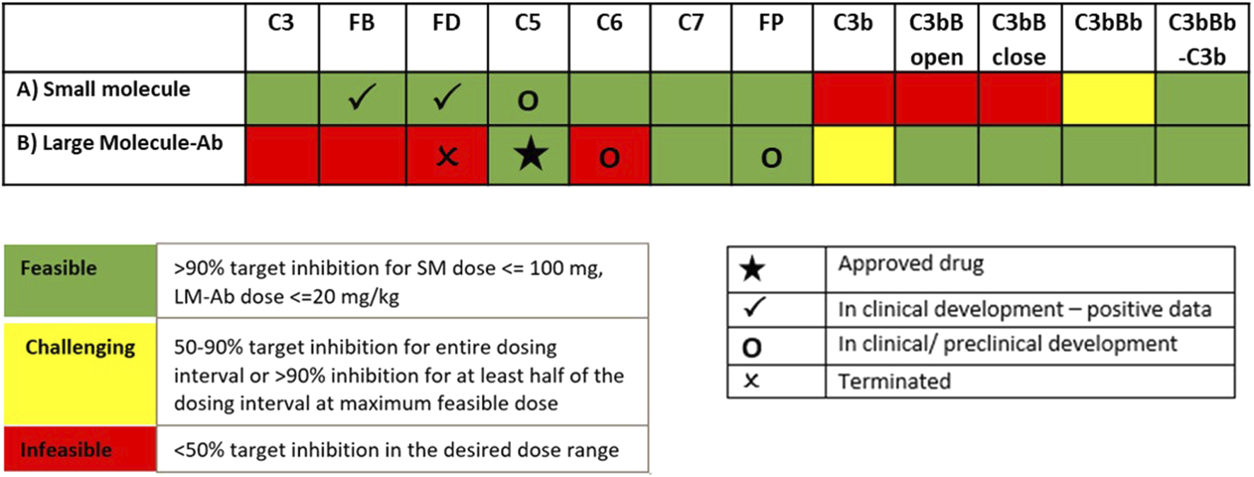 A number of drug candidates are currently in development across the pharmaceutical industry (Harris, 2018; Mastellos et al., 2019; Zelek et al., 2019) for targeting complement proteins. Several complement proteins such as C3, factor B (FB), factor D (FD), C5, C6, and C7 are present in the blood at extremely high concentrations (∼mg/ml) and/or have fast turnover rates (Harris, 2018) as compared to most other targets in inflammatory diseases, such as cytokines (∼pg/ml). This poses challenges around the feasibility of dosing enough for drugs to engage the target and risk of potential side effects due to it. Thus, we have evaluated drug doses needed for small-molecule and large-molecule antibody drugs to engage complement proteins to provide “dosing tractability” estimates within feasible dose ranges of these two modalities.