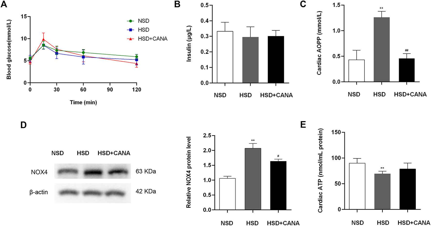 Effects of CANA on blood glucose, oxidative stress, and cardiac ATP production. (A) Oral glucose tolerance (2 mg/kg) after overnight fasting for 12 h; (B) Serum insulin after overnight fasting for 12 h; (C) Cardiac advanced oxidation protein products to assess oxidative stress; (D) Measurement of NOX4 protein levels; (E) Cardiac ATP production was determined in indicated groups. NSD, normal-salt diet; HSD, high-salt diet. **p < 0.01 vs. NSD. #p < 0.05, ##p < 0.01 vs. HSD.