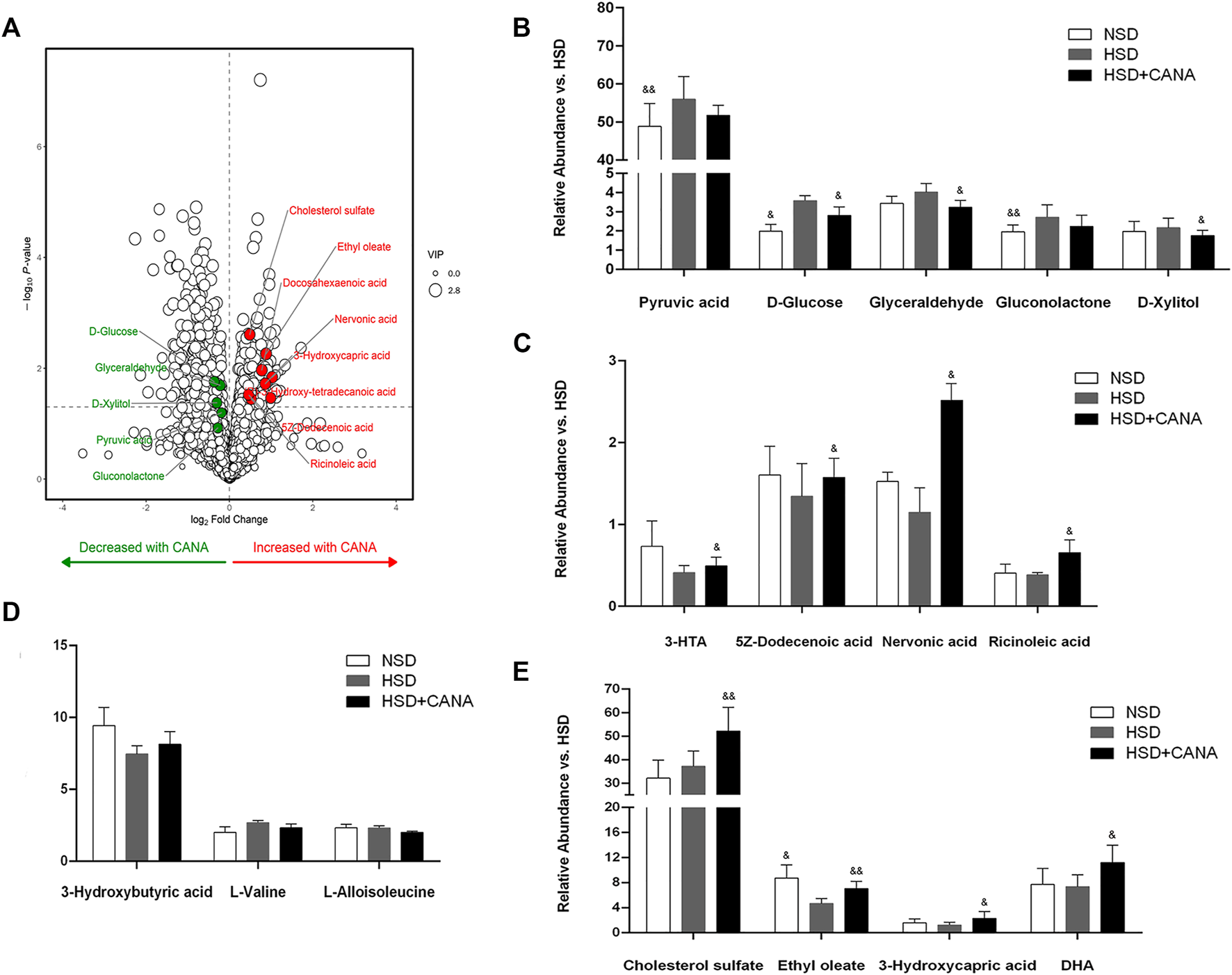 Effect of CANA on metabolic pathways. (A) Volcano plot of cardiac metabolites altered by CANA, in comparison to HSD; (B–E) Representative catabolic metabolites. NSD, normal-salt diet; HSD, high-salt diet; 3-HTA, 3-hydroxy-Tetradecanoic acid; DHA, docosahexaenoic acid; &p < 0.05, &&p < 0.01 vs. HSD.