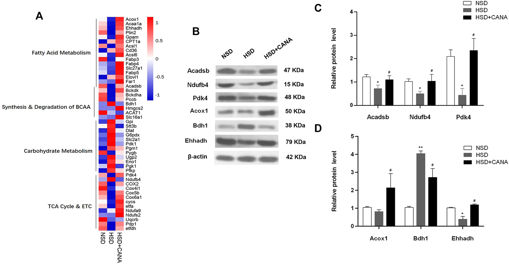 Effect of CANA on the cardiac protein expression. (A) Heat map of individual genes within selected pathways, colored by the log2fold change; (B) Selected genes (Acadsb, Ndufb4, Pdk4, Acox1, Bdh1, and Ehhadh) were validated by Western blotting; (C,D) Quantitative evaluation of the protein expression of selected genes (Acadsb, Ndufb4, Pdk4, Acox1, Bdh1, and Ehhadh). *p < 0.05, **p < 0.01 vs. NSD. #p < 0.05 vs. HSD.