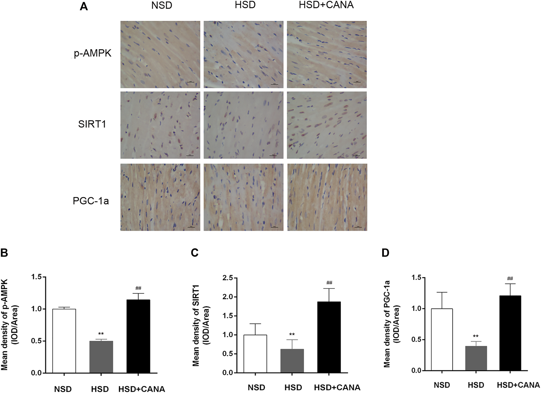 CANA, canagliflozin; NSD, normal-salt diet; HSD, high-salt diet; HW, heart weight; BW, body weight; HW/BW, heart-to-body weight ratio; **p < 0.01 vs. NSD. #p < 0.05, ##p < 0.01 vs. HSD.