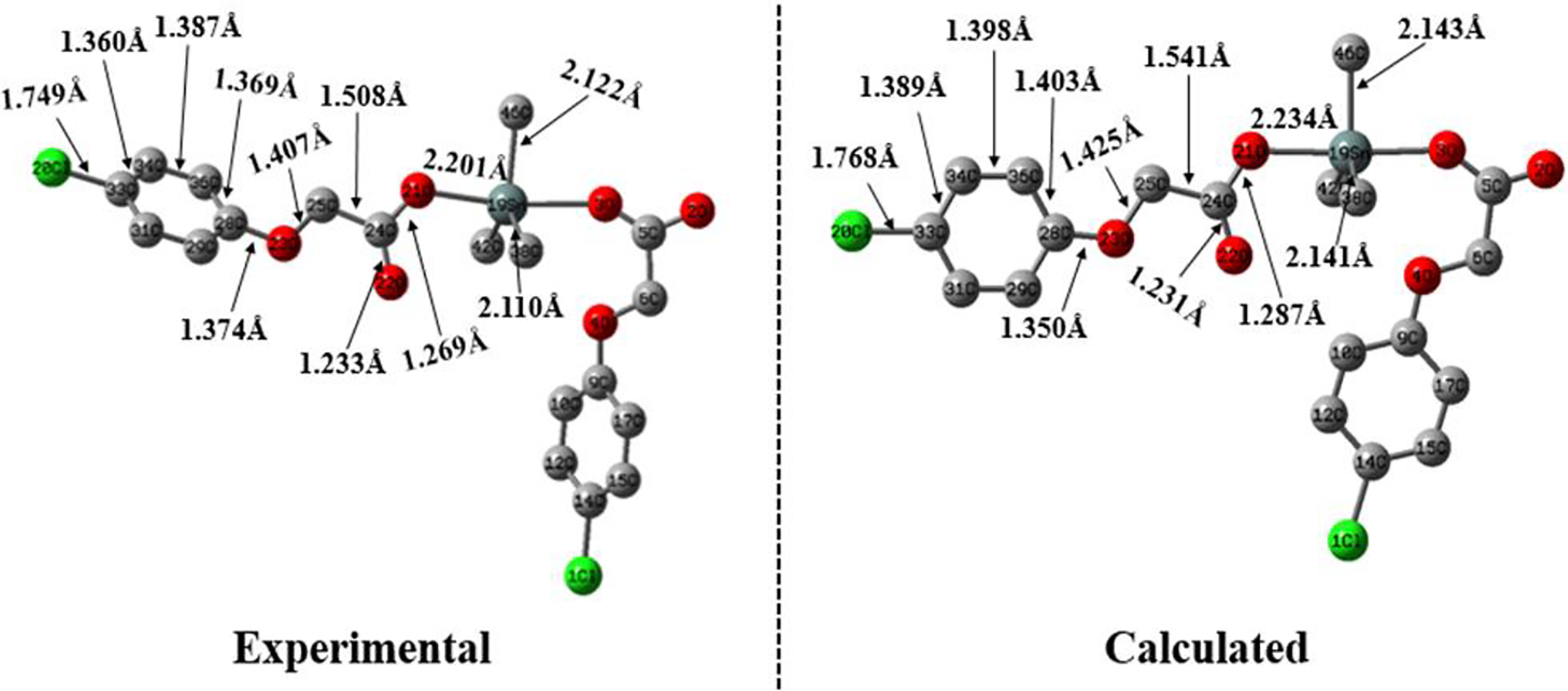 The optimized geometry of complex 4 is shown in Figure 2 at B3LYP/6-31G* + LANL2DZ basis set. For comparative analysis, the single crystal structure of complex 4 is also presented along with its calculated geometry. An overview of both calculated and experimental structures indicates that there is a reasonably good agreement between them. For more detailed structural comparison, the bonds lengths of only one symmetric unit of left-hand side are compared. For instance, the most important Sn-O21 bond lengths are found to be 2.201 and 2.234 Å for experimental and calculated geometries, respectively. Similarly, other important bond lengths of Cl20-C33 are found to be 1.749 and 1.768 Å for experimental and calculated geometries, respectively.