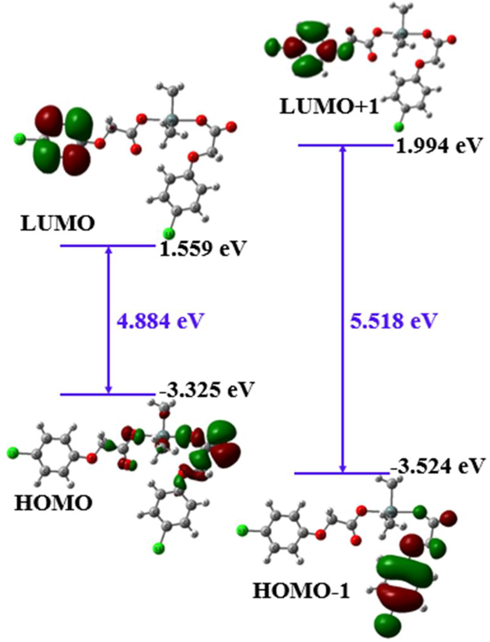 The Frontier molecular orbitals (FMOs) play an essential role in defining the intramolecular charge transfer properties, reactivity and optical properties of a complex. The FMOs of complex 4 are depicted in Figure 4, which include HOMO-1, HOMO, LUMO, LUMO + 1 orbitals along with their orbital energies and orbital energy gaps (Eg). In metal complexes, there are different types of intramolecular charge transfer processes including metal to ligands, ligand to metal and ligand to ligand, etc. A careful analysis of Figure 4 shows that there is ligand to ligand intramolecular charge transfer upon electronic transition. It can be visualized from Figure 4 that the HOMO is localized mainly on the methoxy acetate groups of complex 4, while LUMO is confined to chlorobenzene ring of one side ligand. There is very little and/or negligible electron density on Sn metal which indicates that the Sn metal acts as more like a bridge for intramolecular charge transfer or redistribution upon electron transitions. On the other hand, the distributions of HOMO-1 to LUMO + 1 orbitals solely involve the chlorobenzene rings with significant contributions from chlorine atoms as can be seen in Figure 4. Overall a ligand to ligand charge transfer is evident from the analysis of Frontier molecular orbital analysis which indicates that the optoelectronic properties of complex 4 might be tuned exclusively by the ancillary ligands (Vogler and Kunkely, 1997).