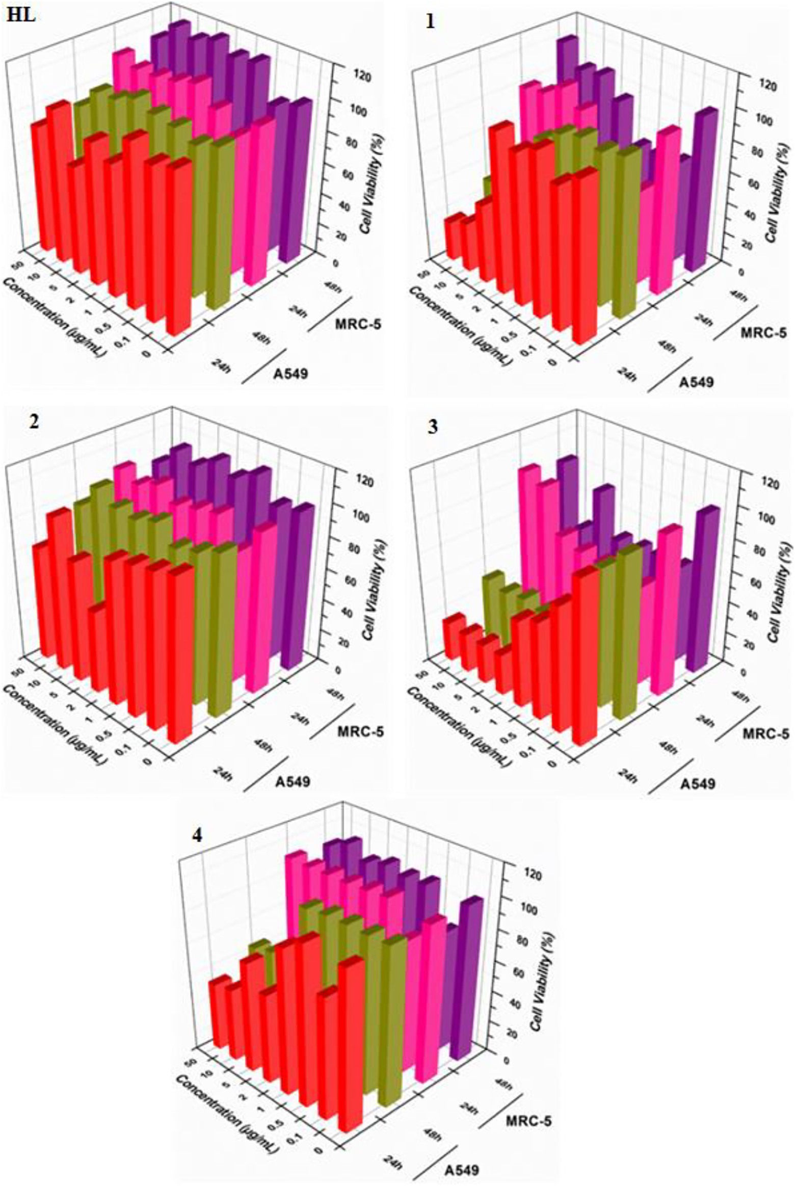 FIGURE 5. Cytotoxic effects of ligand acid (HL) and synthesized complexes (1–4) against A549 and MRC-5.