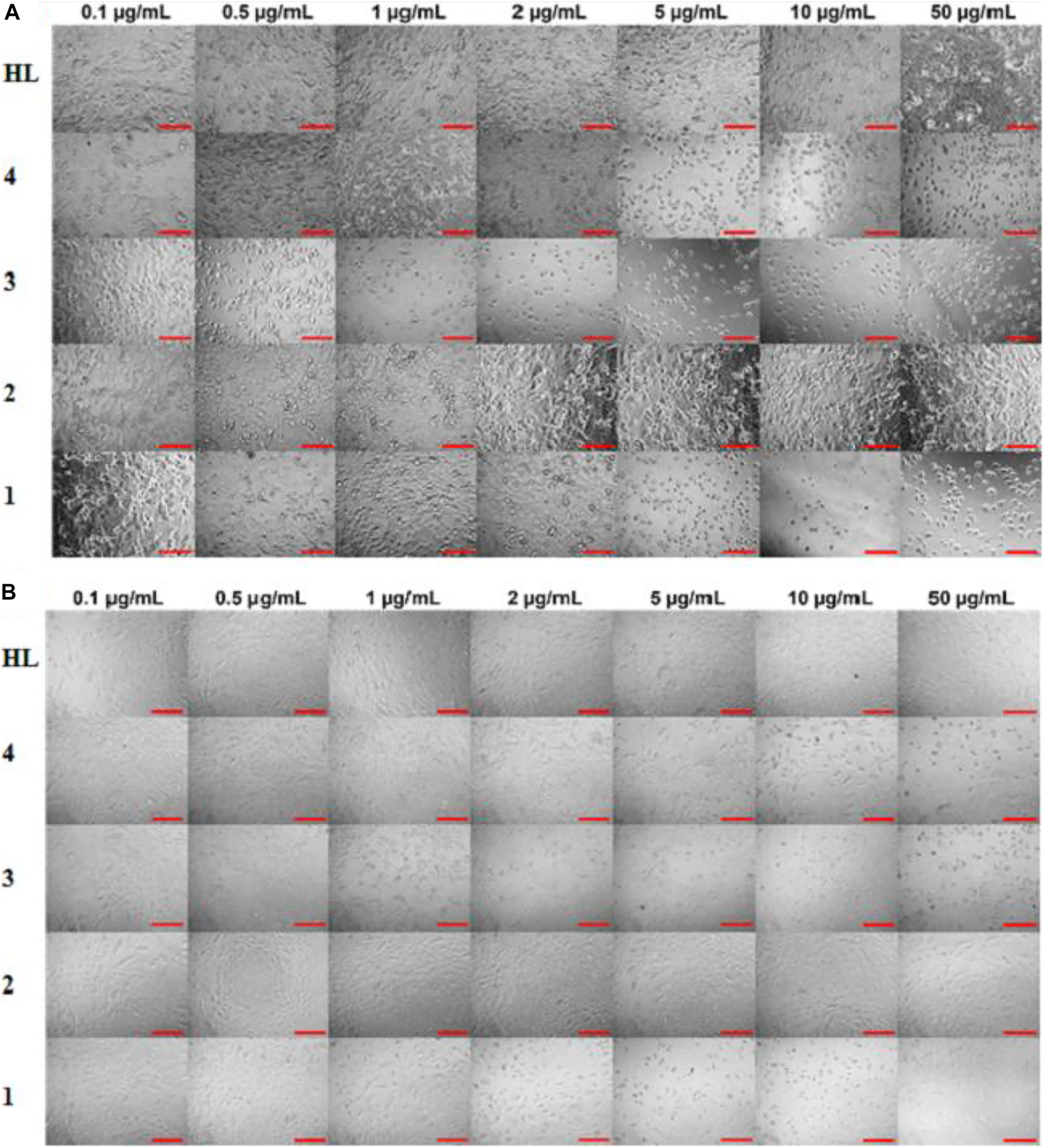 FIGURE 6. Effect of ligand acid (HL) and complexes 1–4 on morphology of (A) A549 and (B) MRC-5 for 48 h. The scale bar is 100 µm.