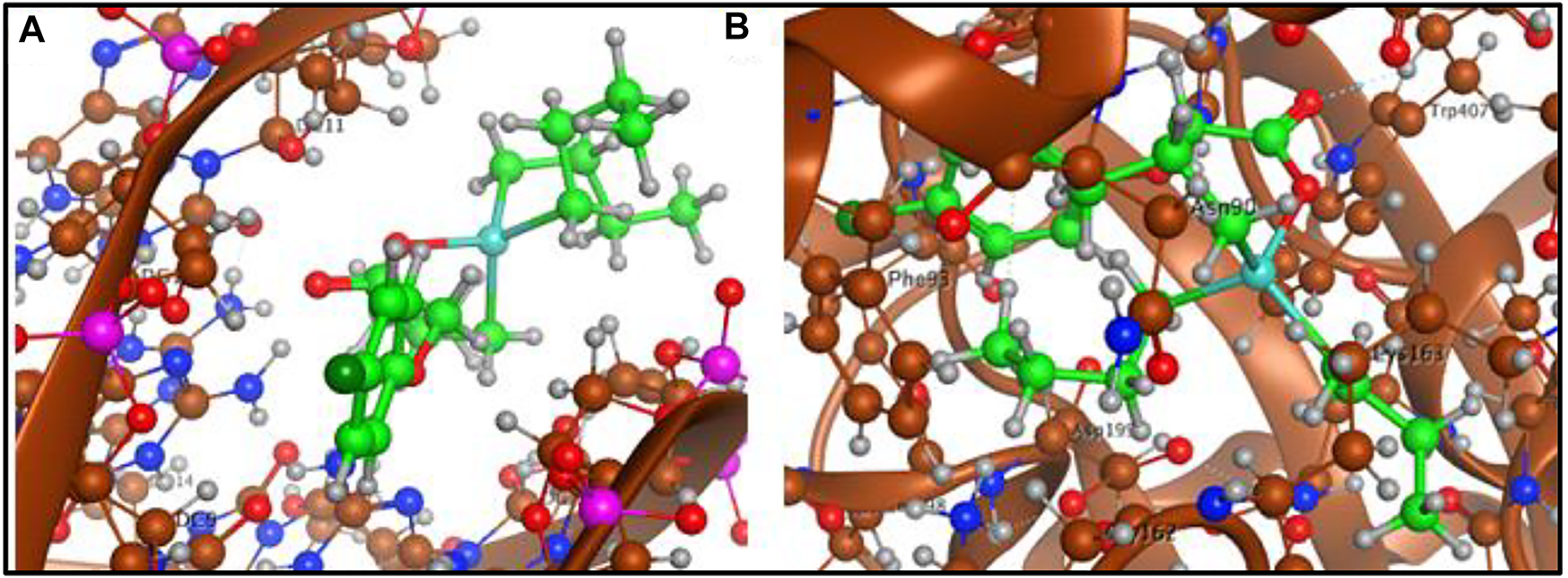 To have a theoretical insight about the anticancer activity of the synthesized complexes, the DNA interactions were performed for the most active complex 3. The complex 3 has shown interaction with DNA in form of intercalation. The complex 3 show four polar interactions (docking score = −3.6005), two H-donor with DG 16, DA 17 and two π-H with DC 9, DG 10 active sites of DNA as shown in Figure 7A.