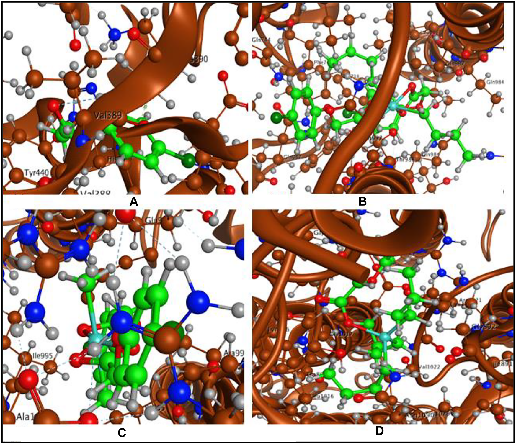 FIGURE 8. (A) Ligand acid (HL)-spike protein interaction, (B) Complex 1-spike protein interaction, (C) Complex 2-spike protein interaction and (D) Complex 3-spike protein interaction.