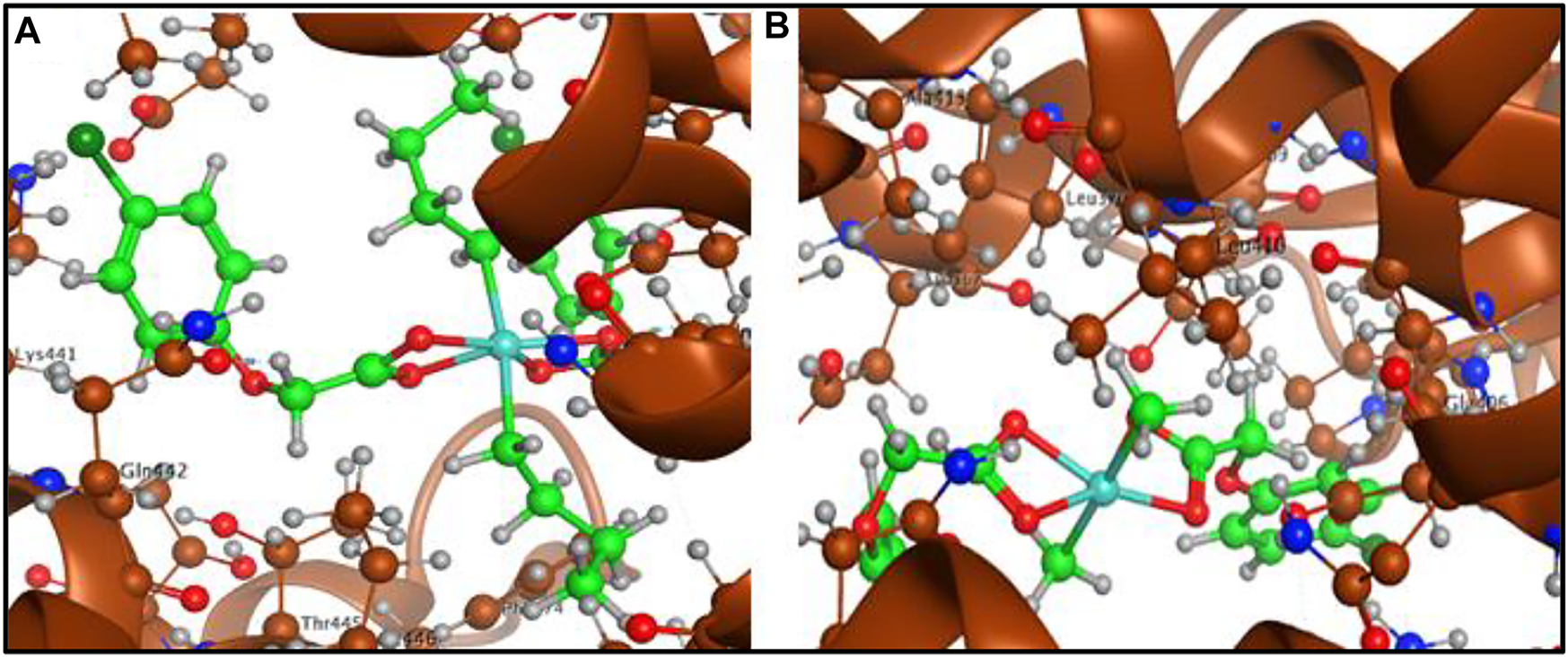 Molecular docking studies with angiotensin converting enzyme also reflected best dock pose for the complex 1 (docking score = −6.1678) with four polar interactions, one H-donor and three H-acceptor interactions with GLN 442, PHE 438, ARG 518 and THR 371 active sites as shown in Figure 10 (a). Complex 2 (docking score = −5.6760) has shown six polar interactions, two H-donor and one H-π and three π-H interactions with GLU 406, ASP 367, HIS 374, THR 371, and LYS 441 active sites as shown in Figure 10B. Complex 3 (docking score = −5.1188), complex 4 (docking score = −3.5105) and ligand acid HL (docking score = −3.4990) have shown one, three and two polar interactions respectively, with the active site residues of the angiotensin converting enzyme as mentioned in Table 6 (Supplementary Figures 14–17). The docking analysis shows that the free ligand acid and its complexes can interact with the three possible targets sites involved in corona disease. The complex 1 with relatively higher docking scores offered the best dock poses for the interaction with the active site residues of all the three targets.