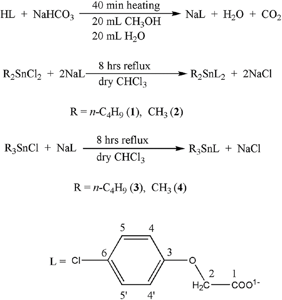Organotin(IV) derivatives (1–4) were made by reacting organotin(IV) chlorides with sodium-4-chlorophenoxyacetate (NaL) at a mole ratio that was appropriate. In dry chloroform, the reaction mixtures were refluxed for 8 h. As crystalline/powdered products, the complexes were produced in a high yield (>80%). At ambient temperature, the complexes are soluble in DMSO and CHCl3.