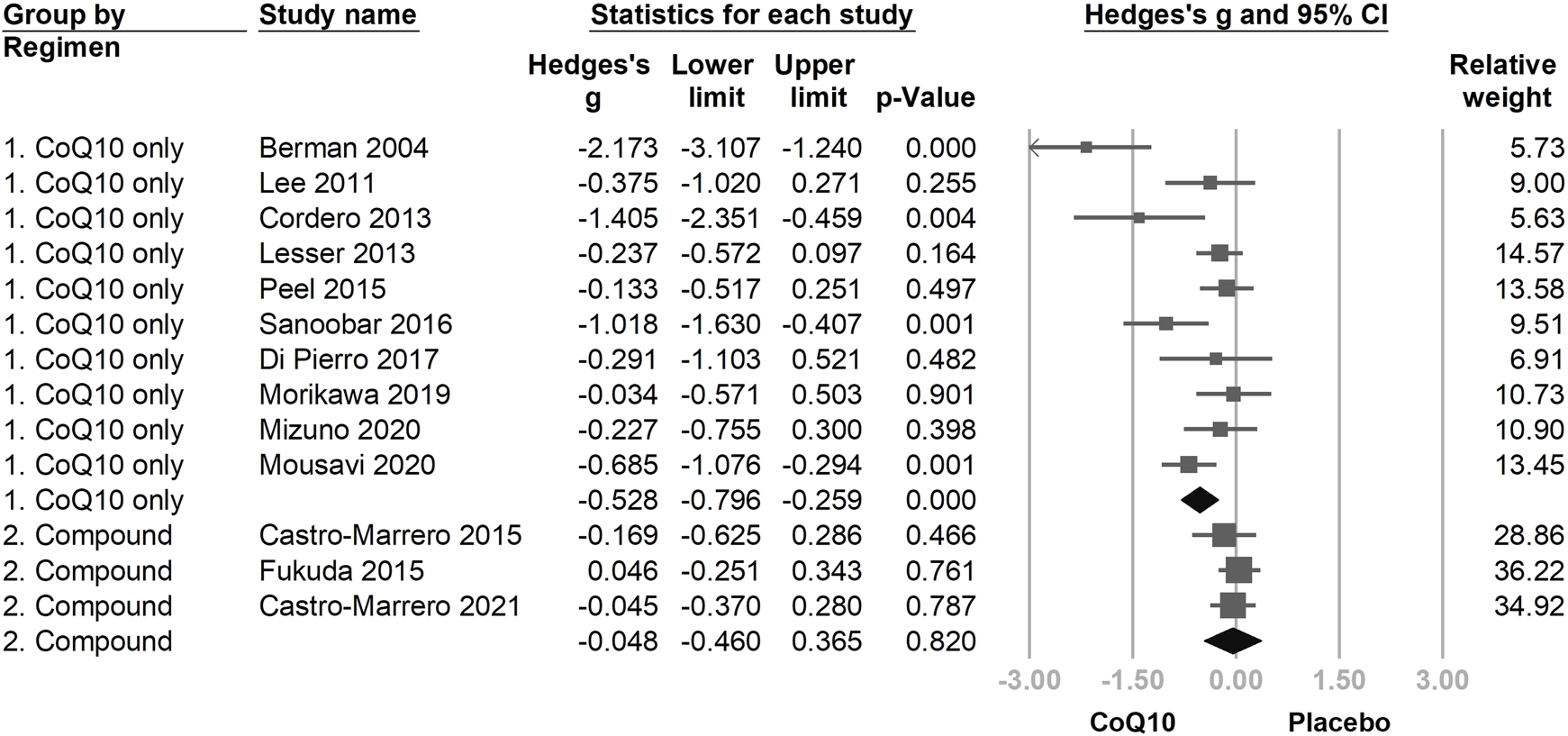 | Castro-Marrero (2021) | Spain | Chronic fatigue syndrome | CoQ10+NADH: 72/0c Placebo: 72/0 |