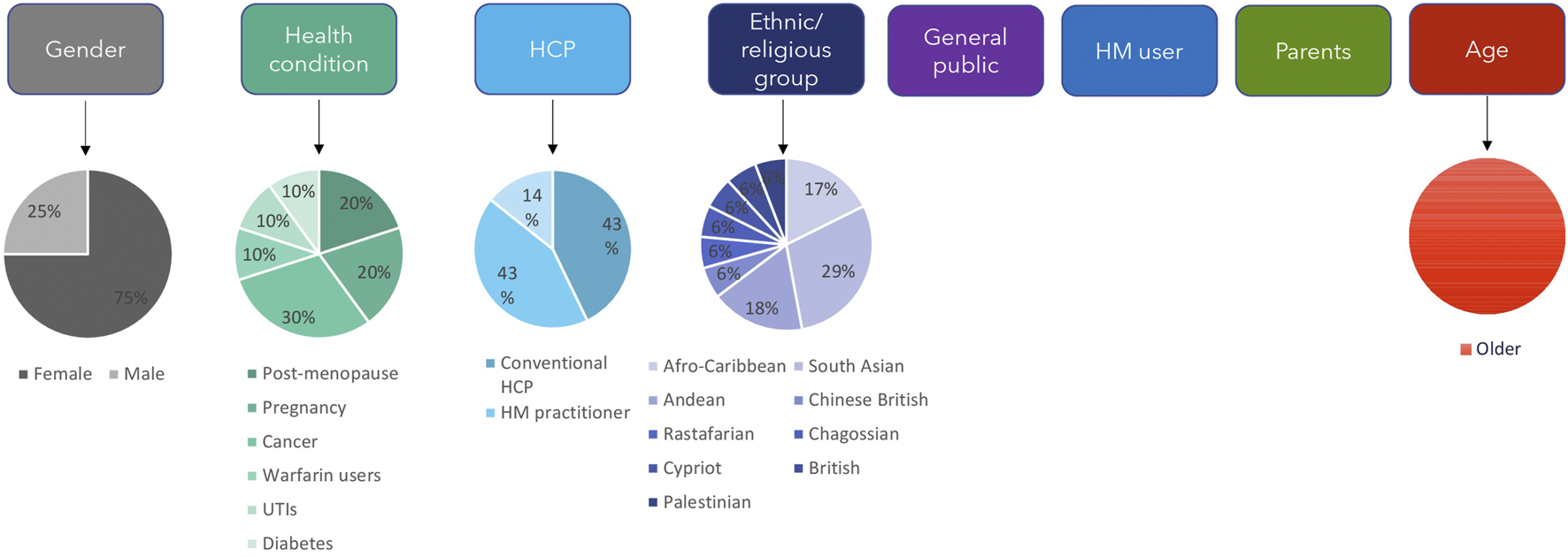 Key population themes and sub-themes. The different population themes for the studies are shown along the top. Age, gender, health condition, HCP and ethnic/religious group are further divided into sub-themes; shown by the pie charts below them that indicate the relative numbers of studies for each sub-theme. HCP: healthcare professional, HM: herbal medicine, UTIs: urinary tract infections.