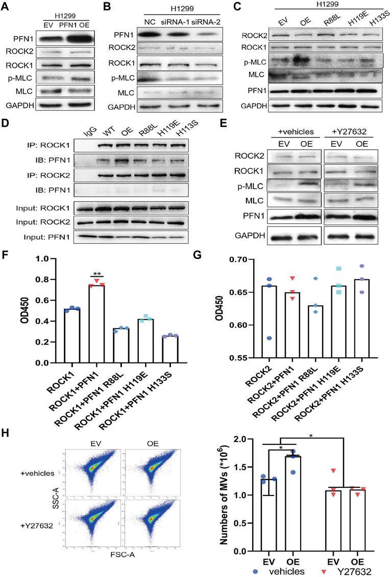 FIGURE 5. Mechanisms underlying the promotion of MLC phosphorylation by PFN1. (A,B) Protein expression after PFN1 overexpression (A) and knockdown (B) measured using western blotting. (C) Protein expression in PFN1 mutants measured using western blotting. (D) PFN1 interactions with ROCK1/2 confirmed using co-IP. (E) Protein expression after treatment with Y27632 (10 µM) measured using western blotting. (F) Effect of PFN1 on ROCK1 activity. **p < 0.01. (G) Effect of PFN1 on ROCK2 activity. (H) Flow cytometry measuring changes in the amount of MVs after treatment with Y27632; *p < 0.05.