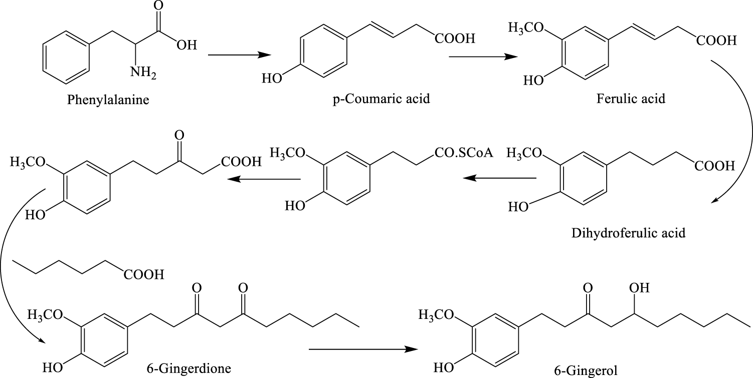 The biosynthetic pathway of gingerol was described by Denniff et al. (1981). As shown in Figure 2, phenylalanine is converted to dihydroferulic acid which participates in the biological reaction of Claisen, malonate, and hexanoate for the production of 6-dehydrogingerdione followed by 6-gingerol as a final compound (Semwal et al., 2015).