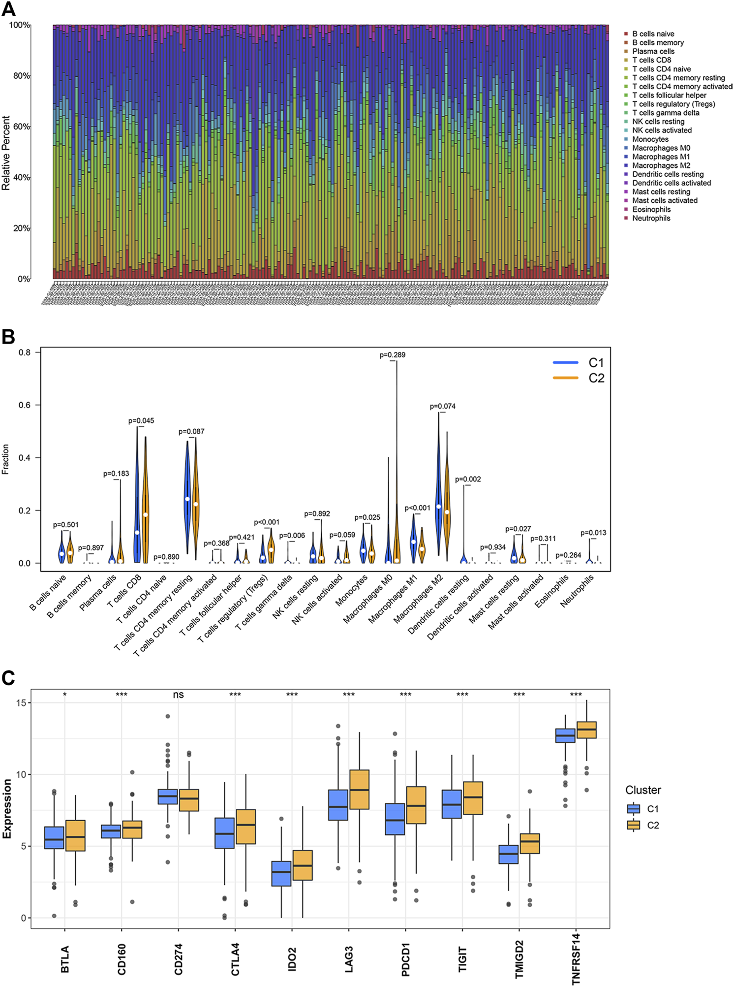 Levels of immune cell infiltration and the expression of the inhibitory immune checkpoints in the two clusters. (A,B) Abundance of the 22 immune cell types belonging to the two clusters. (C) Differential expression of the inhibitory immune checkpoints between two clusters. ∗p < 0.05, ∗∗p < 0.01, ∗∗∗p < 0.001.