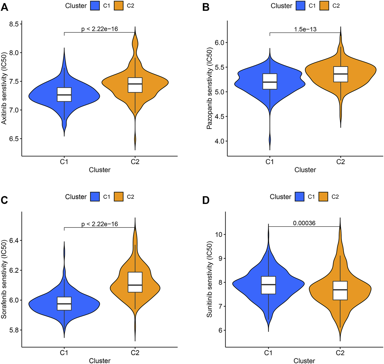 The IC50 values of four targeted drugs in two clusters. (A) Axitinib. (B) Pazopanib. (C) Sorafenib. (D) Sunitinib.