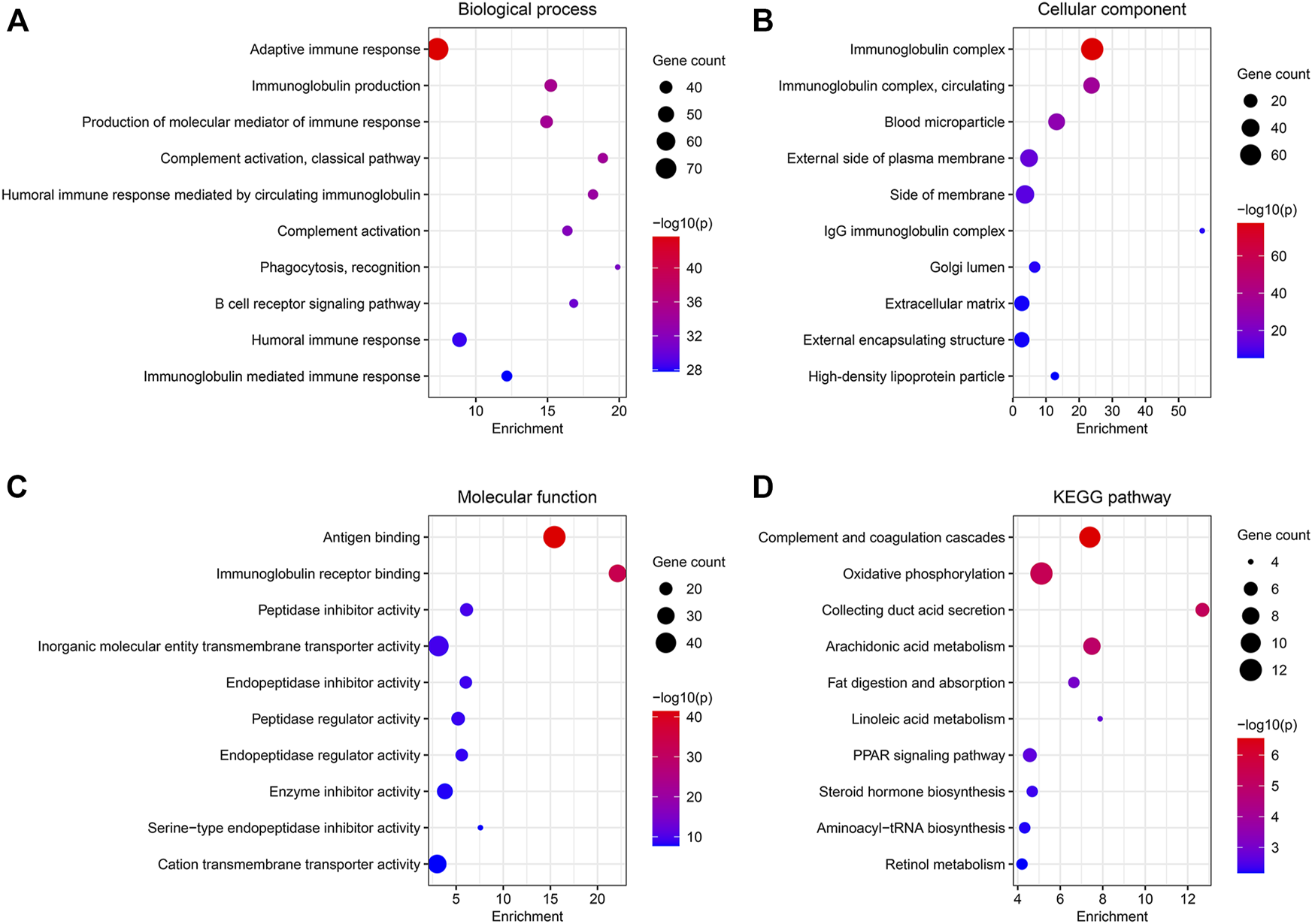 A total of 538 DEGs were identified under conditions of |log2(FC)| > 1.5 and FDR <0.05. GO and KEGG pathway analyses were used to study the functions of the DEGs. BP terms include “adaptive immune response,” “immunoglobulin production,” and “production of molecular mediator of immune response” (Figure 4A). The genes associated with CC were enriched in “immunoglobulin complex,” “blood microparticle,” and “external side of plasma membrane” (Figure 4B). In MF, the genes were associated with “antigen-binding,” “immunoglobulin receptor binding,” and “peptidase inhibitor activity” (Figure 4C). Results obtained from KEGG analyses revealed significant enrichment in the genes associated with “complement and coagulation cascades,” “oxidative phosphorylation,” and “collecting ductile acid secretion” (Figure 4D).