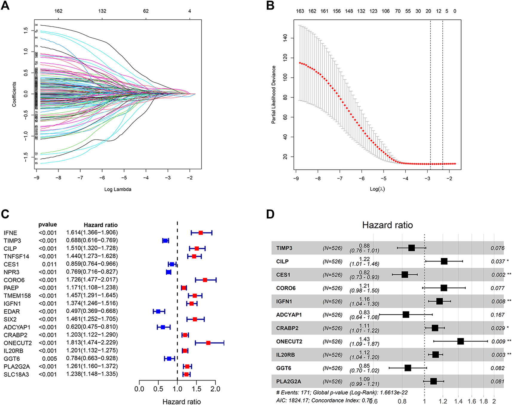 Construction of the prognostic risk model. (A,B) LASSO regression analysis was used to calculate the optimal lambda. min value = 19. (C) Results of univariate Cox regression analysis of 19 genes selected by LASSO regression analysis. (D) Results obtained from the multivariate Cox regression analysis of the 19 genes selected using the LASSO regression analysis.