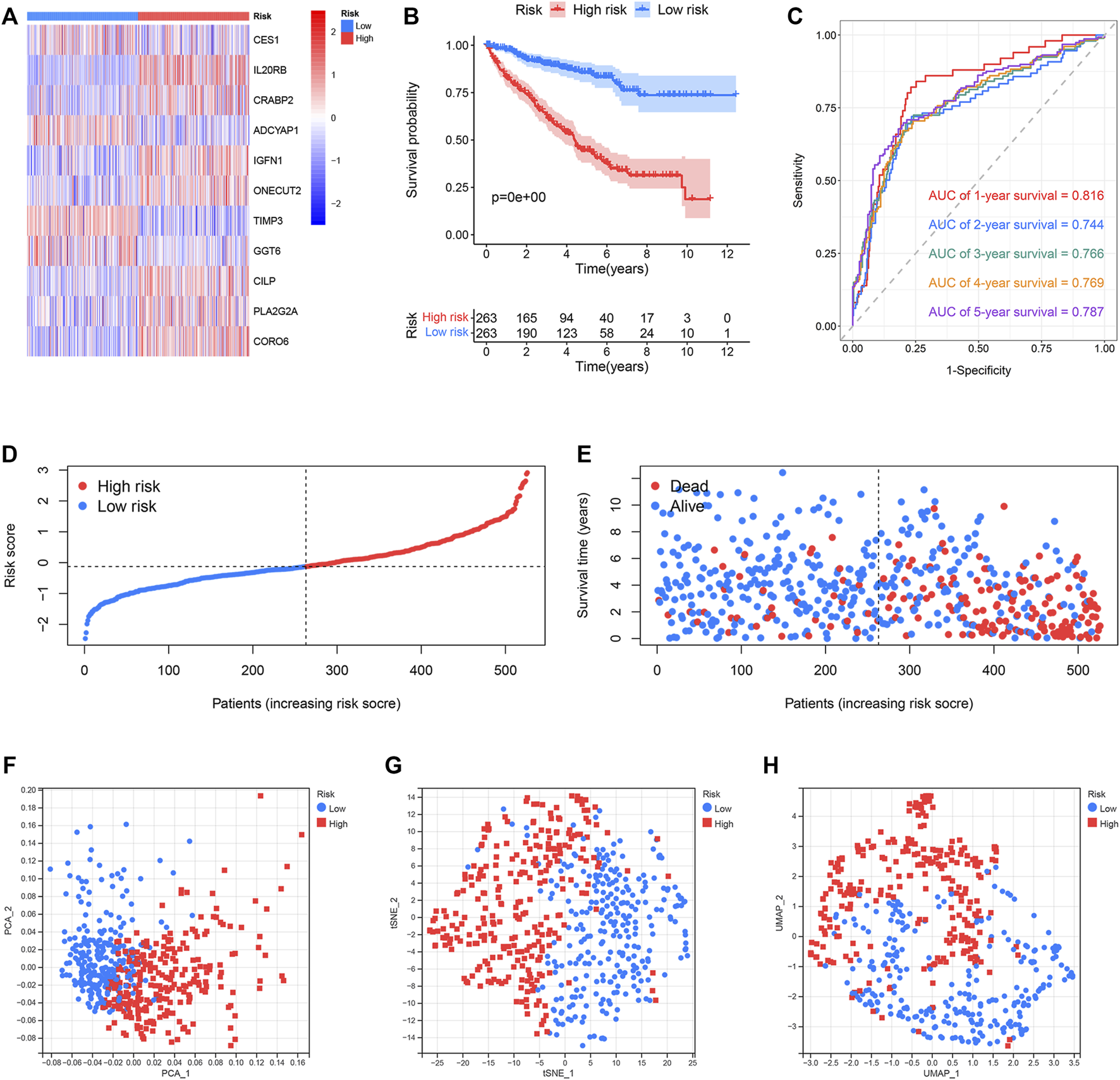 Predictive performance of the prognostic risk model in the TCGA dataset. (A) Expression distribution of 11 selected genes. (B) OS of the high- and low-risk groups. (C) ROC curves of the prognostic risk model generated for predicting the 1-, 2-, 3-, 4-, and 5-year OS. (D) Distribution of the risk score. (E) Distribution of ccRCC samples characterized by different risk scores and survival status. (F–H) PCA, t-SNE, and UMAP for the high- and low-risk groups.