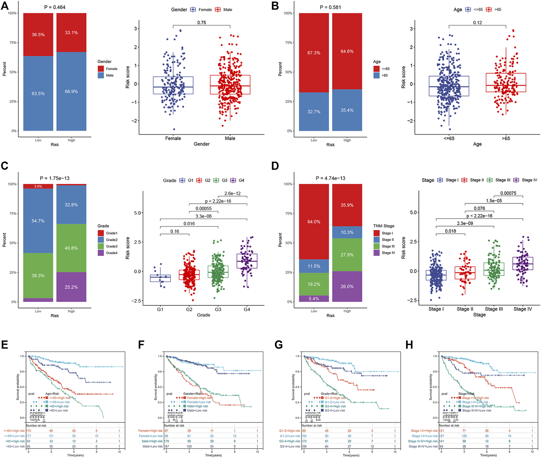 Correlation between ER stress-related prognostic risk model and clinical parameters in the TCGA dataset. (A–D) Distribution of risk scores stratified by gender, age, tumor grade, and TNM stage, and composition of clinical parameters between high- and low-risk groups. (E–H) OS of the high- and low-risk groups combined with different clinical parameters in the TCGA dataset.