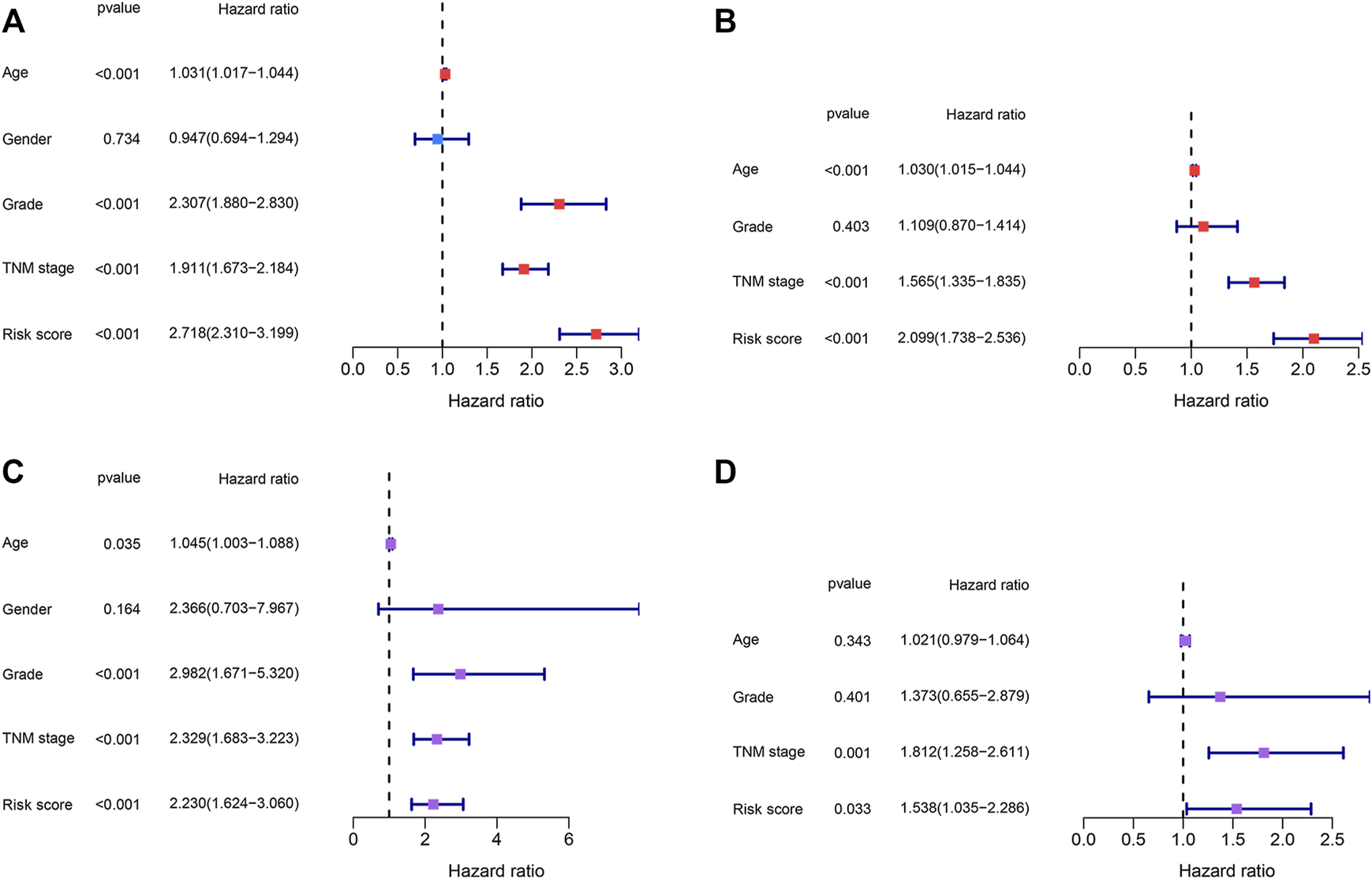 Identification of the independent prognostic factors. (A,B) Univariate and multivariate Cox regression analyses of the risk score and clinical parameters in the TCGA dataset. (C,D) Univariate and multivariate Cox regression analyses of the risk score and clinical parameters in the E-MTAB-1980 dataset.