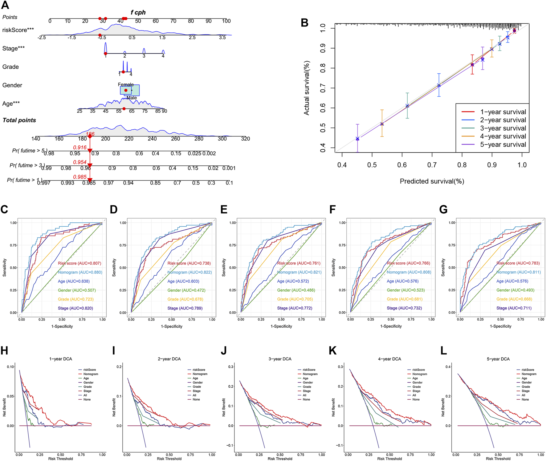 Construction and validation of a nomogram for predicting OS in TCGA dataset. (A) Construction of a nomogram based on age, gender, tumor grade, stage, and risk score. (B) Verification of the predictive accuracy of the nomogram by calibration curves. (C–G) ROC curves of the nomogram, risk score, and clinical parameters for predicting the 1-, 2-, 3-, 4- and 5-year OS. (H–L) DCA curves for comparing the net survival benefit of the nomogram, risk score, and clinical parameters.