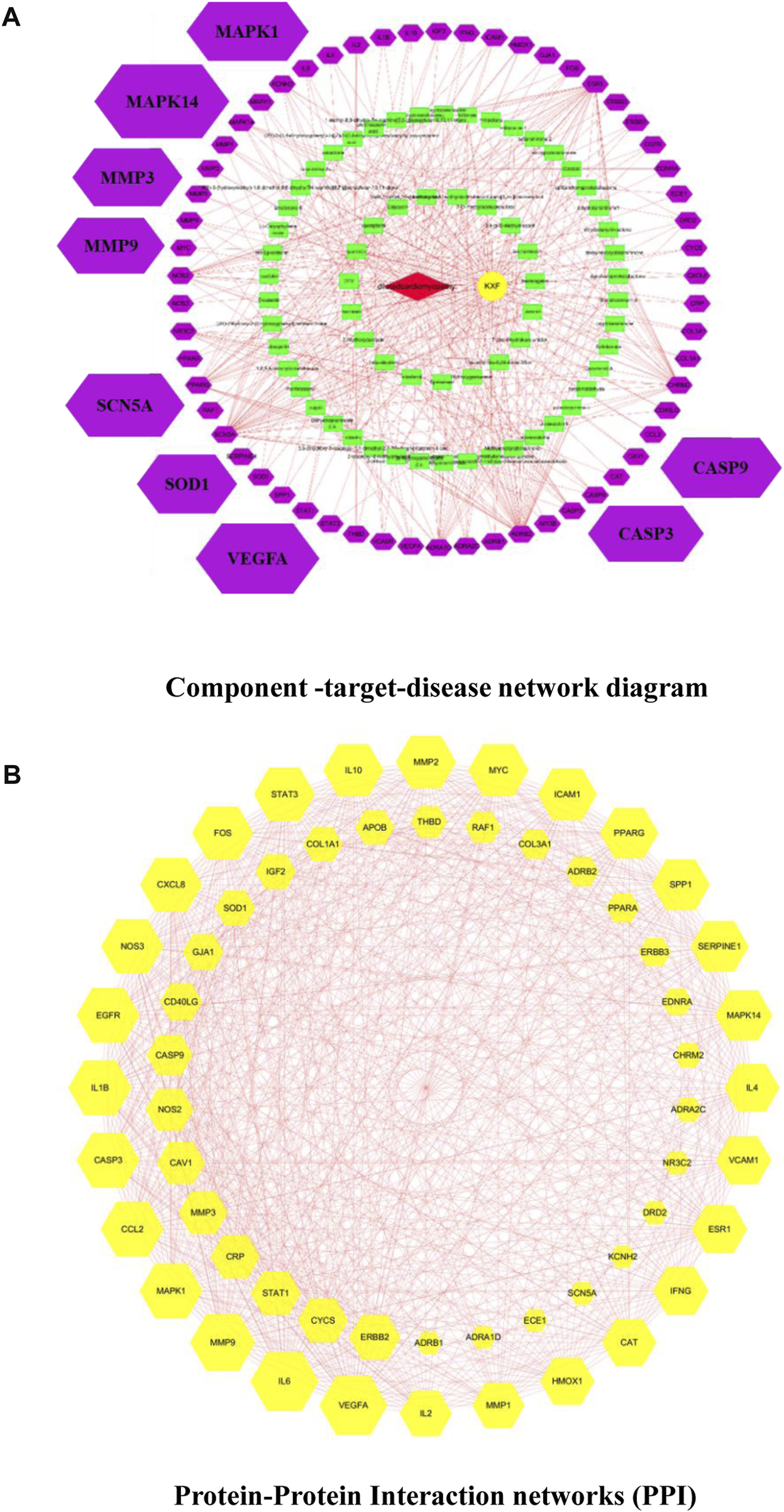 (A). Component-target–disease network diagram. Cross-references to KXF and DCM targets to identify potential targets of KXF associated with DCM. Red nodes represent DCM. The yellow node represents KXF. Green nodes represent the compounds in KXF. Purple nodes represent potential targets of KXF of DCM. (B). Protein–protein interaction network (PPI) shows the interactions between overlapping genes. The yellow node represents a gene, and the red line represents the interaction between genes. The larger the area covered by a gene, the more pronounced the effect of KXF has on that gene.