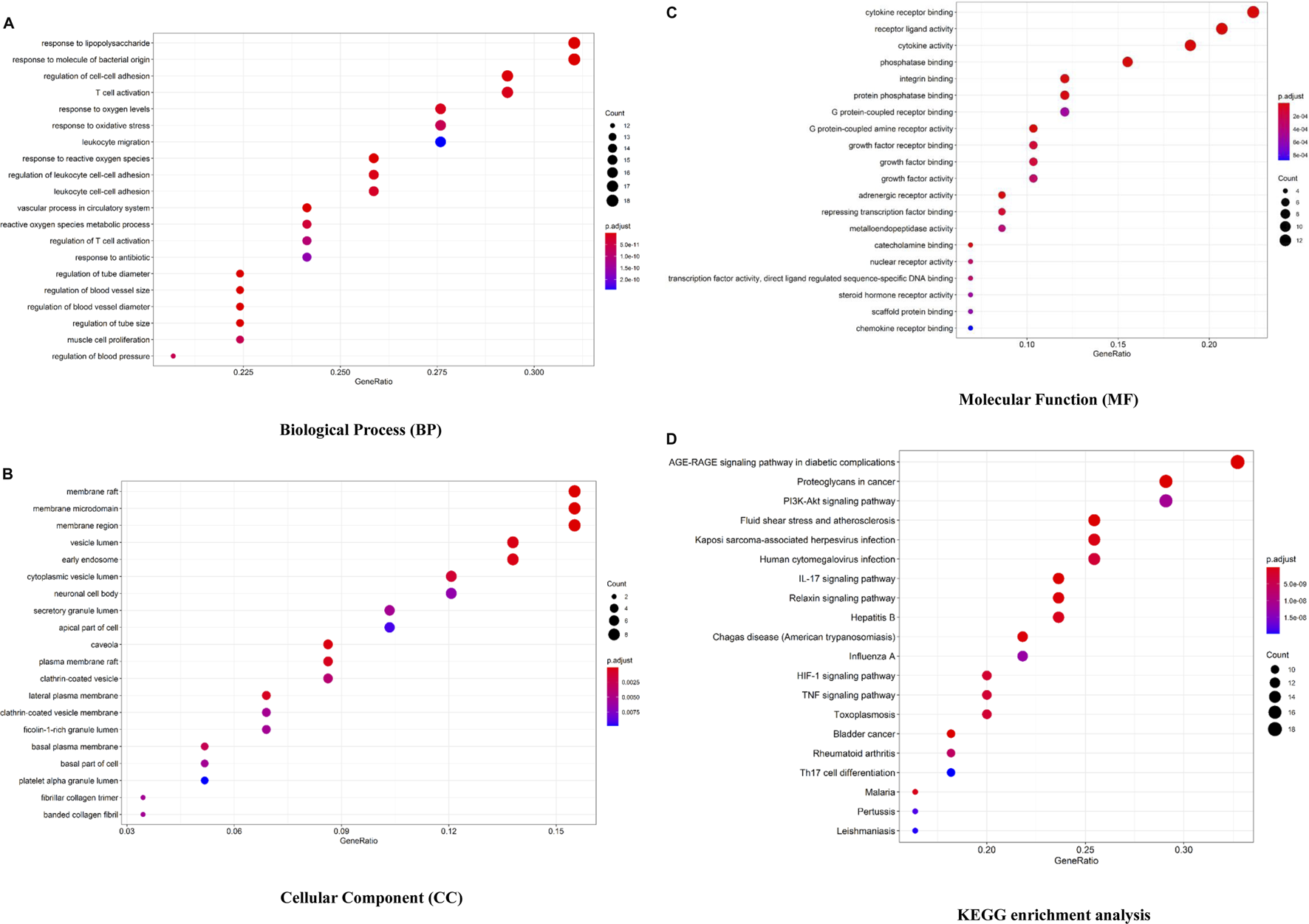 Bioconductor database-enriched pathways and GO entries. (A). GO enrichment entries in the top 20 about the biological process (BP). (B). GO enrichment entries in the top 20 about cellular component (CC). (C). GO enrichment entries in the top 20 about molecular function (MF). (D). KEGG enrichment entries in the top 20 (p 0.05). The color of the bubble represents the value of p, and the size of the bubble represents the count of relative entries.