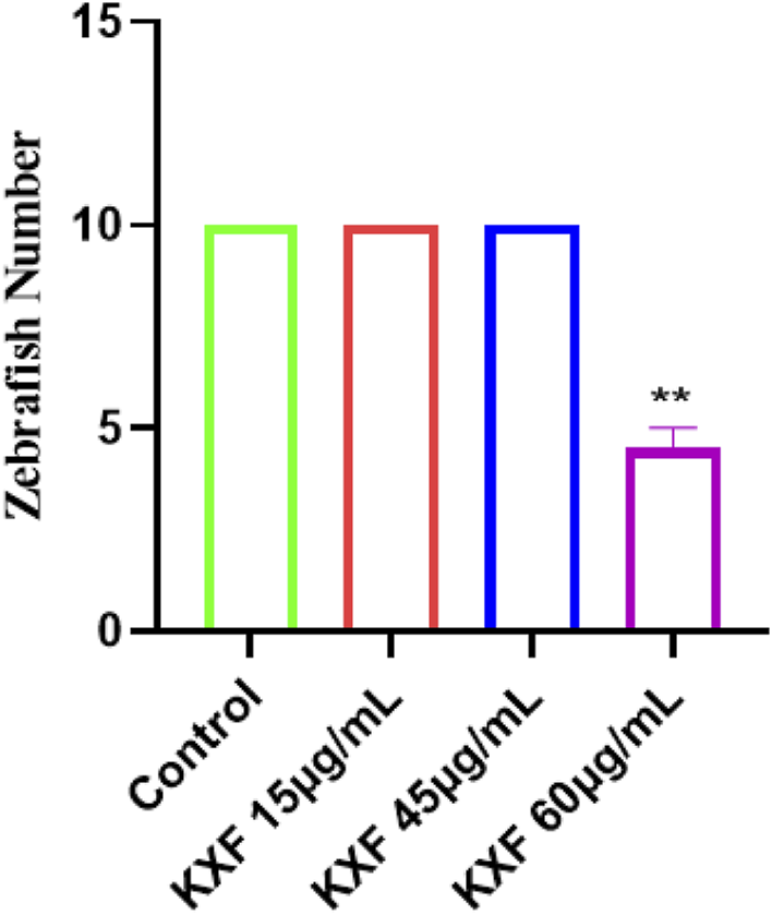 Toxicity analysis of KXF in zebrafish. Tg (Flila: egfp; Gata1: dsred) transgenic zebrafish of 48hpf was treated with different dosages of KXF for 48 h to determine the safe dosage of KXF. Quantitation of the survival zebrafish number. **p 0.01 vs. control group.