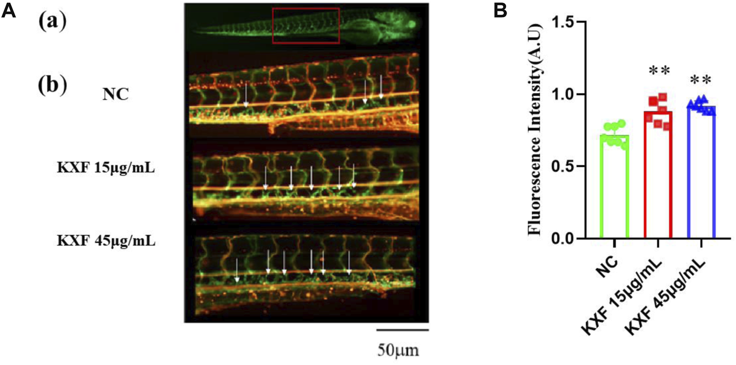 KXF increased the lymphatic thoracic duct formation in zebrafish. (A). Confocal image of the 96 hpf. zebrafish vascular system. (A). The red-boxed region indicates the area of the confocal image (from the seventh or eighth to the 18th somite). (B). Representative confocal images show that KXF promoted the thoracic lymphatic duct formation in zebrafish, the white arrow indicates the thoracic lymphatic duct; (B). Quantitation of the fluorescence intensity of the thoracic lymphatic duct. **p 0.01 vs. NC group.