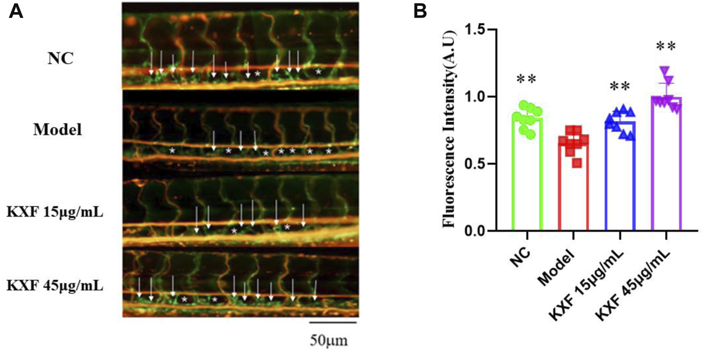 The 48hpf zebrafish were picked out and divided into 4 groups: the NC group, the model group, the low KXF (15 μg/ml) group, and the high KXF (45 μg/ml) group. The 48 hpf zebrafish embryos were treated with different dosages (15, 45 μg/ml) of KXF for 48 h with a pre-treatment of 30 μM MAZ51 (a selective inhibitor of VEGFR-3(Flt-4) tyrosine kinase) for 6 h. Embryos of the NC group were treated with 0.2% DMSO served as the vehicle control. Each group consisted of 30 fish.