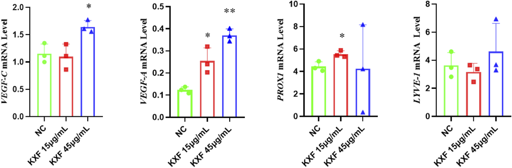 As shown in Figure 8, VEGF-C, VEGF-A, and PROX1 mRNA levels were significantly increased in the KXF-treated group compared with the NC group (p 0.05), while the LYVE-1 mRNA levels had no significant difference between the NC group and other groups (p 0.05).