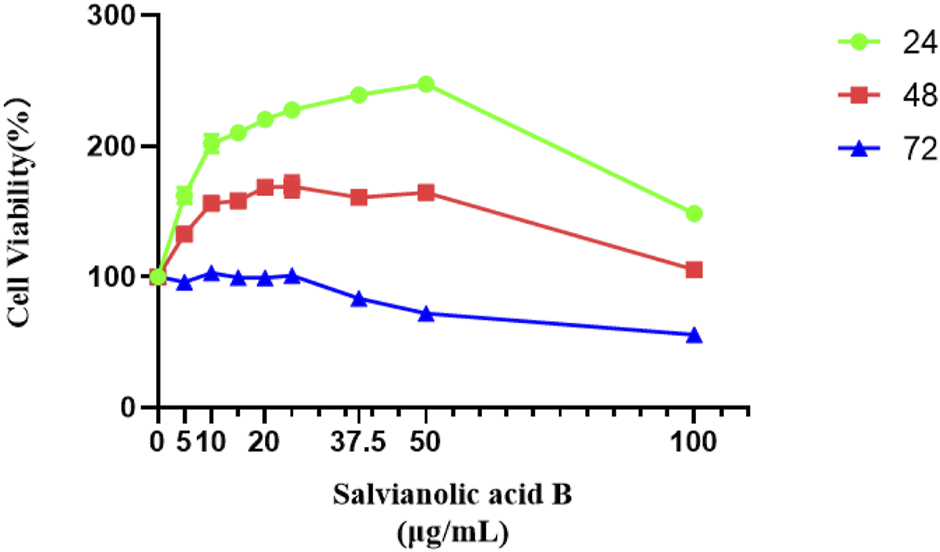 According to the manufacturer’s instructions, the proliferation of LECs was determined by the Cell Counting Kit-8 (CCK-8). The cells were seeded into 96-well plates at the density of 7 10^2 cells/well and incubated with MEM-ALPHA (2% FBS) in an incubator with an environment of 37°C and 5% CO2 for 24 h. After that, the culture medium was replaced with MEM-ALPHA (2% FBS) containing different concentrations of Salvianolic acid B (SAB, the major active ingredient of KXF) (5, 10, 15, 20, 25, 37.5, 50, and 100 μg/ml) and MEM-ALPHA (2% FBS) was as the vehicle control. After 24, 48, and 72 h, 10 μL of the CCK-8 solution was added to each well and incubated for another 2 h. Finally, the optical density (OD) of the cells was measured at 450 nm. The cell viability was calculated as follows: