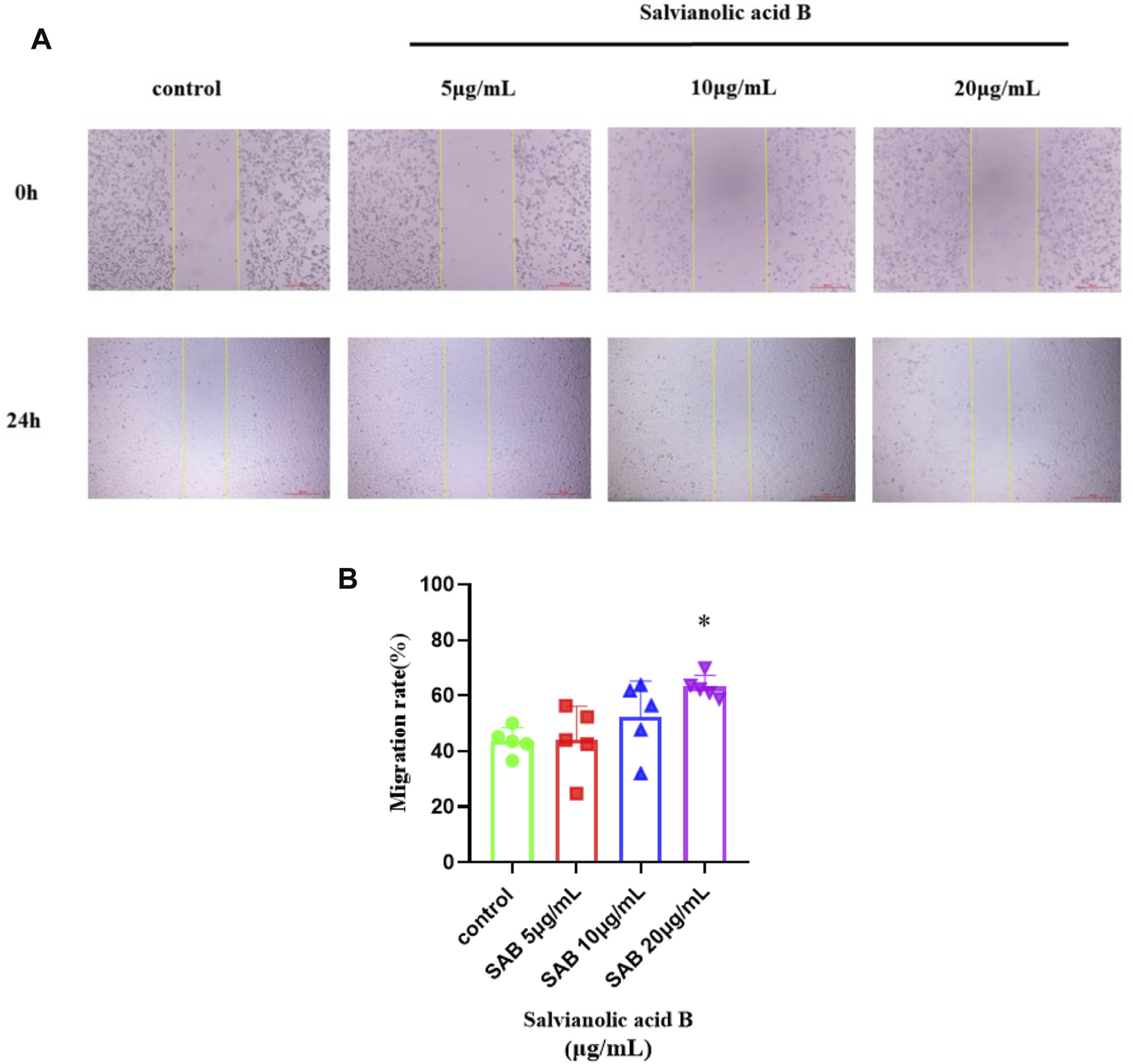 Four straight lines were drawn on the bottom of the 6-well plate using the sterilized ruler. The cells were plated in a 6-well plate at the density of 4 10^5cells/well and incubated with MEM-ALPHA (10% FBS) in an incubator with an environment of 37°C and 5% CO2. After 24 h, a 200 μl yellow pipette tip was used to draw a scratch perpendicular to the lines on the bottom of the plate, and non-adherent cells were gently washed off with PBS. After that, MEM-ALPHA (1% FBS) containing different concentrations of Salvianolic acid B (5, 10, and 20 μg/ml) was added in the wells, respectively, and MEM-ALPHA (1% FBS) was as the vehicle control. Then, the wound width was recorded using an inverted microscope after 0 and 24 h with a magnification of 4 , and the formula was as follows:
