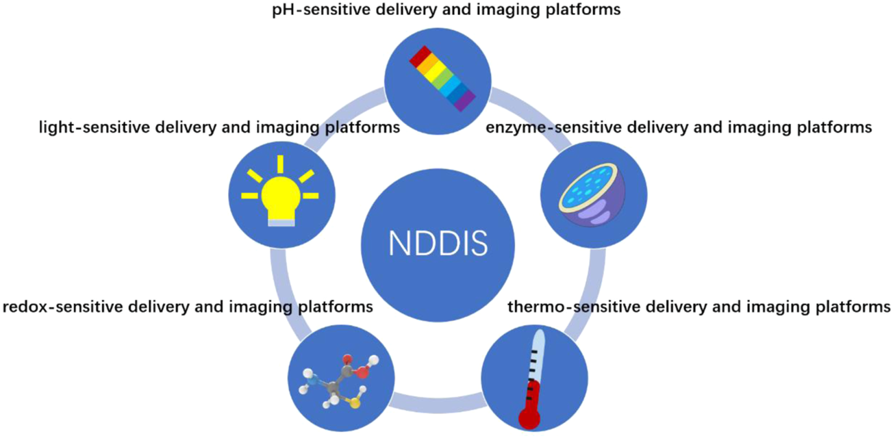 Smart NDDIP combined with stimuli-sensitive properties that can either respond to physical or biological stimuli has recently become the center of attention. According to special characteristics of the diseased microenvironment, NDDIP for drug delivery and imaging platforms can be classified into pH-sensitive delivery and imaging platforms, enzyme-sensitive delivery and imaging platforms, thermo-sensitive delivery and imaging platforms, redox-sensitive delivery and imaging platforms, and light-sensitive delivery and imaging platforms as seen in Table 1 and Figure 1.