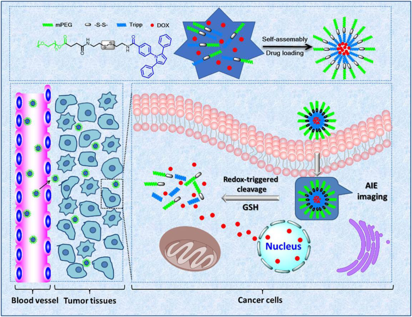 | mPEG-ss-Tripp | Redox-sensitive | AIE imaging | Tumor tissue | Disulfide bonds are sensitive to reductive substance GSH, which quickly cleaved through thiol-disulfide exchange to release DOX | Sun et al. (2021) |
