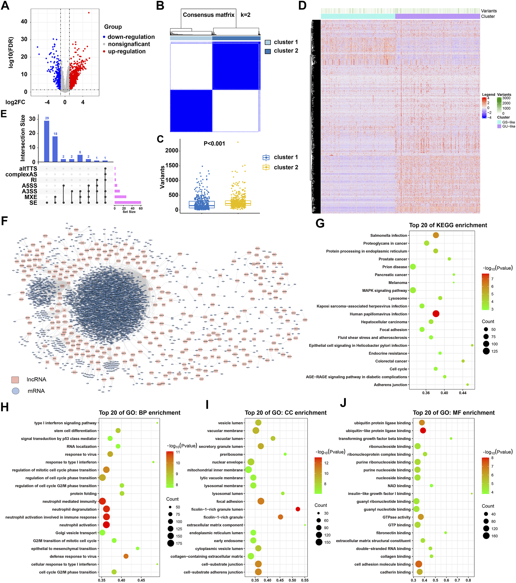 Identification and functional analysis of GIRlncRNAs for NSCLC patients. (A) Volcano plot of the GIRlncRNA distribution. 1,446 DE-lncRNAs between the GU group (n = 244) and GS group (n = 244) are shown. (B) Unsupervised clustering of 975 NSCLC patients according to the expression pattern of identified GIRlncRNAs. Cluster 1, light blue box. Cluster 2, dark blue box. (C) Mutation frequency analysis of DE-lncRNAs in two clusters derived from unsupervised clustering analyses. Cluster 1, blue scatterplot. Cluster 2, orange scatterplot. (D) Expression heatmap of DE-lncRNAs from 975 NSCLC patients. Subtype classification was performed by unsupervised hierarchical clustering analysis. Cluster 1 (cyan box) is designated as the GS-like group, and cluster 2 (orchid box) is designated as the GU-like group. (E) Upset plotting the statistical AS events of 60 DE-lncRNAs. (F) Co-expression network of mRNA-interacting GIRlncRNAs based on Pearson correlation coefficient. (G) Enriched KEGG pathways for the mRNA-interacting GIRlncRNAs. (H–J) Enriched GO pathways for the mRNA-interacting GIRlncRNAs in three parts: BP (H), CC (I), and MF (J).