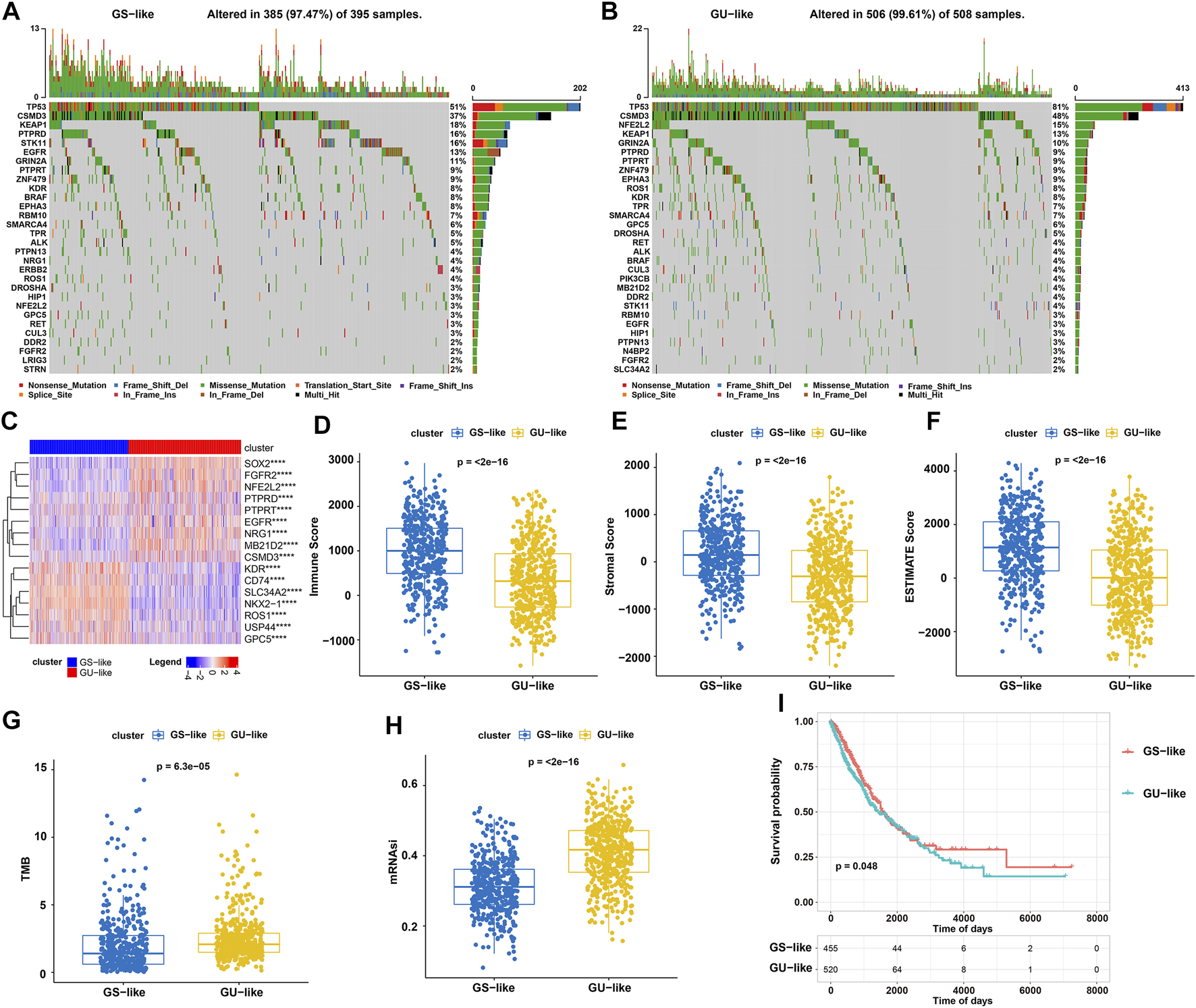 Mutation and expression landscapes of driver genes, tumor microenvironment assessment, and Kaplan–Meier survival analyses. (A,B) Mutation frequency of 54 driver genes (top 30) in 395 GS-like (A) and 508 GU-like (B) NSCLC patients. Each column represents an individual patient. The upper barplot indicates TMB, and the number on the right indicates the mutation frequency for each regulator. The right barplot shows the proportion of each variant type. (C) Expression landscape of 17 driver genes differently expressed between GS and GU-like patients. (D–H) Immune (D), stromal (E), and ESTIMATE (F) score and TMB (G) and mRNAsi (H) analyses in GS and GU-like groups. (I) Survival analysis of GS and GU-like groups of NSCLC patients.