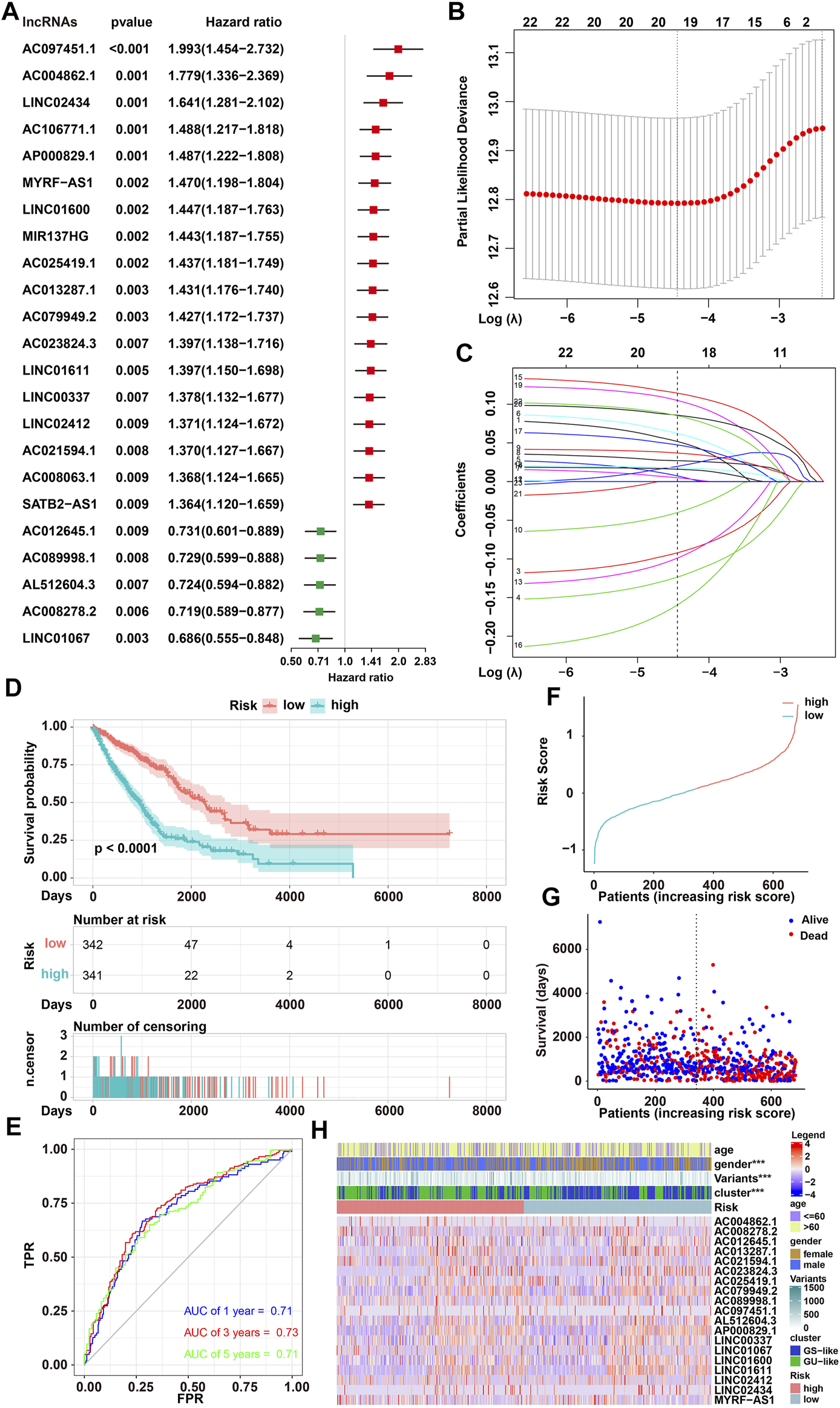 Identification of the GIRlncSig and its predictive performance in a training set. (A) Forest plot of OS-associated GIRlncRNAs based on the univariate Cox proportional hazards regression analysis. Five GIRlncRNAs acted as protective risk factors for patients’ survival (green), while 18 GIRlncRNAs acted as prognostic risk factors (red). (B) Distribution plot of partial likelihood deviation based on LASSO regression analysis. Nineteen GIRlncRNAs were selected when log lambda was equal to −4.4 (the minimum). (C) Distribution plot of LASSO coefficient (log lambda = −4.4). (D) Kaplan–Meier survival curves of low and high-risk NSCLC patients predicted by the GIRlncSig (log-rank test, p < 0.0001). (E) ROC of NSCLC patients at 1, 3, or 5 years predicted by GIRlncSig. (F,G) Risk distribution (F) and survival status (G) of NSCLC patients. (H) Expression heatmap of selected GIRlncRNAs.