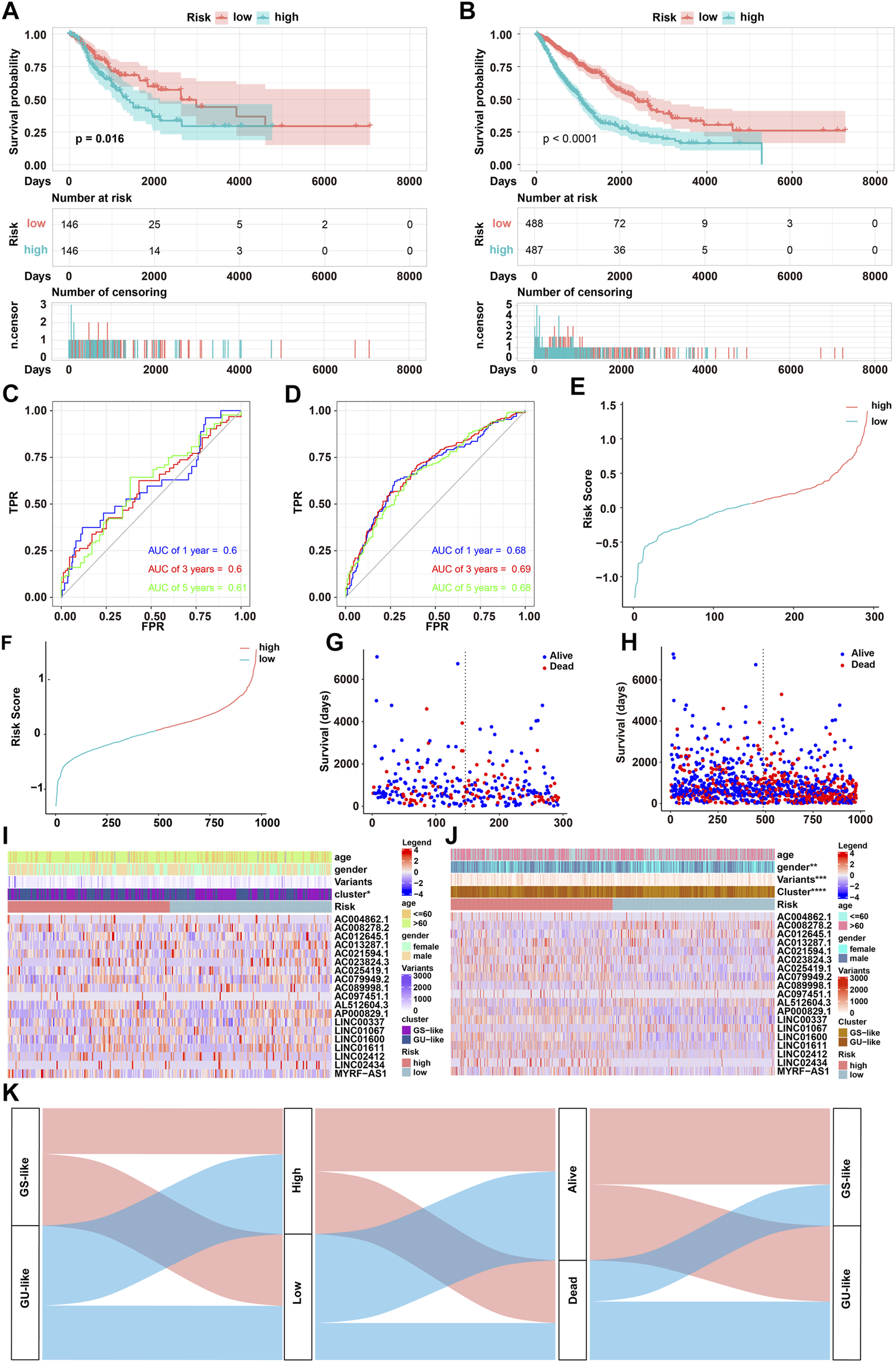 Performance evaluation of GIRlncSig in testing and TCGA sets. (A,B) Kaplan–Meier survival curves of GIRlncSig-predicted low- or high-risk NSCLC patients in testing [(A), log-rank test; p < 0.05] and TCGA [(B), log-rank test, p < 0.0001] sets. (C,D) ROC of 1-, 3-, or 5- year survival predicted by GIRlncSig in testing (C) and TCGA (D) sets. (E–J) Risk distribution, survival status of patients, and the expression profile of GIRlncSig in testing (E,G,I) and TCGA (F,H,J) sets. (K) Sankey diagram for the distribution of NSCLC patients in GS or GU-like groups, low or high-risk groups, and dead or alive groups.