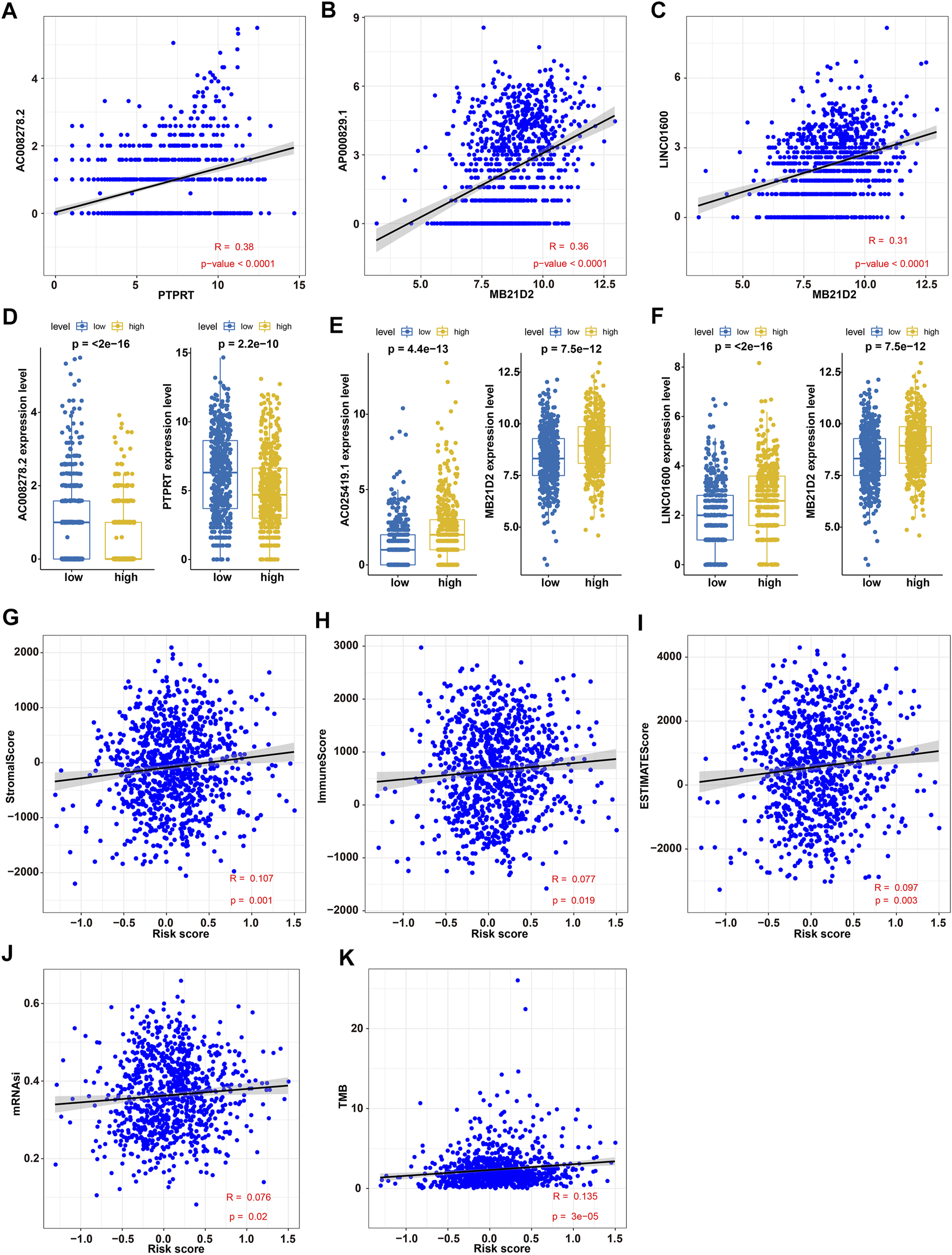 Correlation analyses between GIRlncSig and malignant characteristics of NSCLC. (A–C) Pearson correlation analysis of GIRlncRNA-driver gene regulatory pairs: AC008278.2 and PTPRT (A), AP000829.1 and MB21D2 (B), LINC01600 and MB21D2 (C); (D–F) Differential expression analysis of correlated regulatory pairs in different risk groups: AC008278.2 and PTPRT (D), AP000829.1 and MB21D2 (E), and LINC01600 and MB21D2 (F). (G–K) Pearson correlation analysis between the risk score and immune score (G), stromal score (H), ESTIMATE score (I), mRNAsi score (J), or TMB score (K) in NSCLC patients.