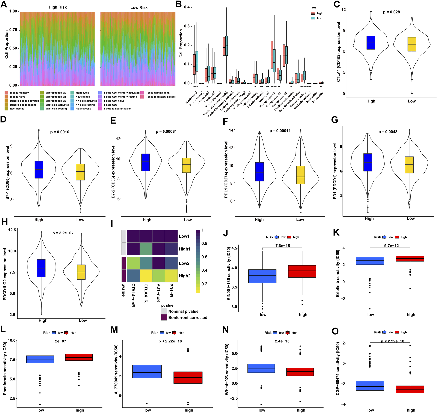 Immune evaluation and drug resistance analyses in high- and low-risk groups of NSCLC patients. (A) Distribution of 22 types of immune cells in high- and low-risk groups of NSCLC patients. (B) Boxplot of differentially infiltrated immune cells in high- and low-risk groups of NSCLC patients (p < 0.05). (C–H) Violin plot of the differentially expressed checkpoint genes in high- and low-risk NSCLC patients. (I) Immunotherapy response predicted for high- and low-risk NSCLC patients by SubMap module. (J-O) Chemotherapeutic sensitivity predicted for high- and low-risk NSCLC patients by the pRRophetic package.