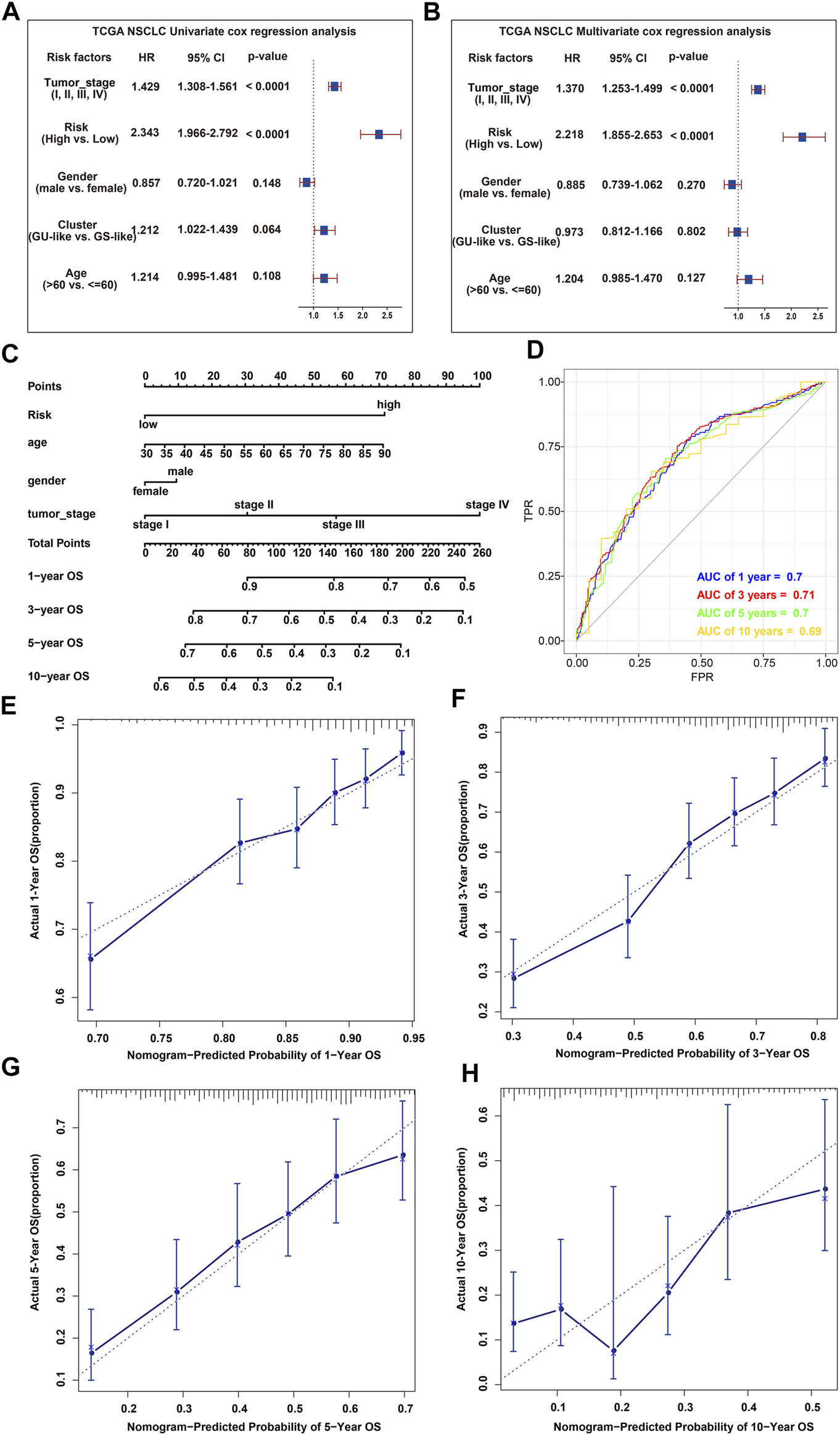 Independent prognostic evaluation and nomogram construction. (A,B) UCRA (A) and MCRA (B) based on GIRlncSig-based risk scores together with clinical variables; (C) MCRA-developed nomogram for predicting 1-, 3-, 5-, and 10-year survival of NSCLC patients; (D) MCRA-developed ROC for predicting 1-, 3-, 5-, and 10-year survival of NSCLC patients; (E–H) Calibration curves for predicting 1- (E), 3- (F), 5- (G), and 10- (H) year survival of NSCLC patients.