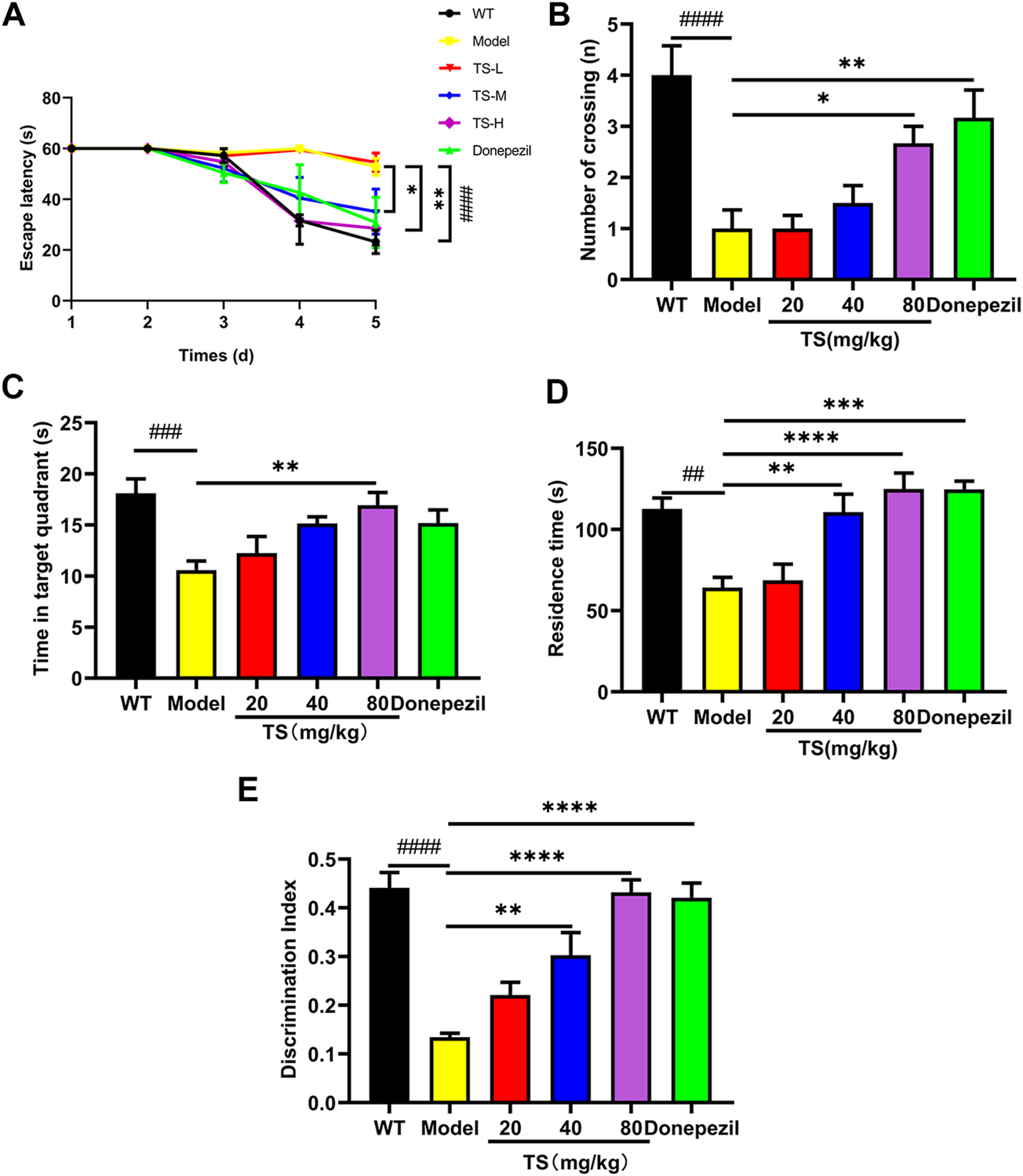 TS ameliorated cognitive impairment in APP/PS1 mice. (A) The effect of TS on the escape latency in APP/PS1 mice was investigated by Morris water maze (####p < 0.0001, *p = 0.0277, **p = 0.0010). (B) The effect of TS on the number of crossing platform in APP/PS1 mice was investigated by Morris water maze (####p < 0.0001, *p = 0.0353, **p = 0.0044). (C) The effect of TS on the time spent in the target quadrant in APP/PS1 mice by Morris water maze (###p = 0.0007, **p = 0.0042). (D) The effect of TS on the residence time in APP/PS1 mice was evaluated by Y-maze test (##p = 0.0015, **p = 0.0024, ***p = 0.001, ****p < 0.0001). (E) The effect of TS on the discrimination index in APP/PS1 mice was investigated by NOR test (####p < 0.0001, **p = 0.0021, ****p < 0.0001). # Compared with WT group; * Compared with model group. Data are presented as mean ± S.E.M. (n = 10).