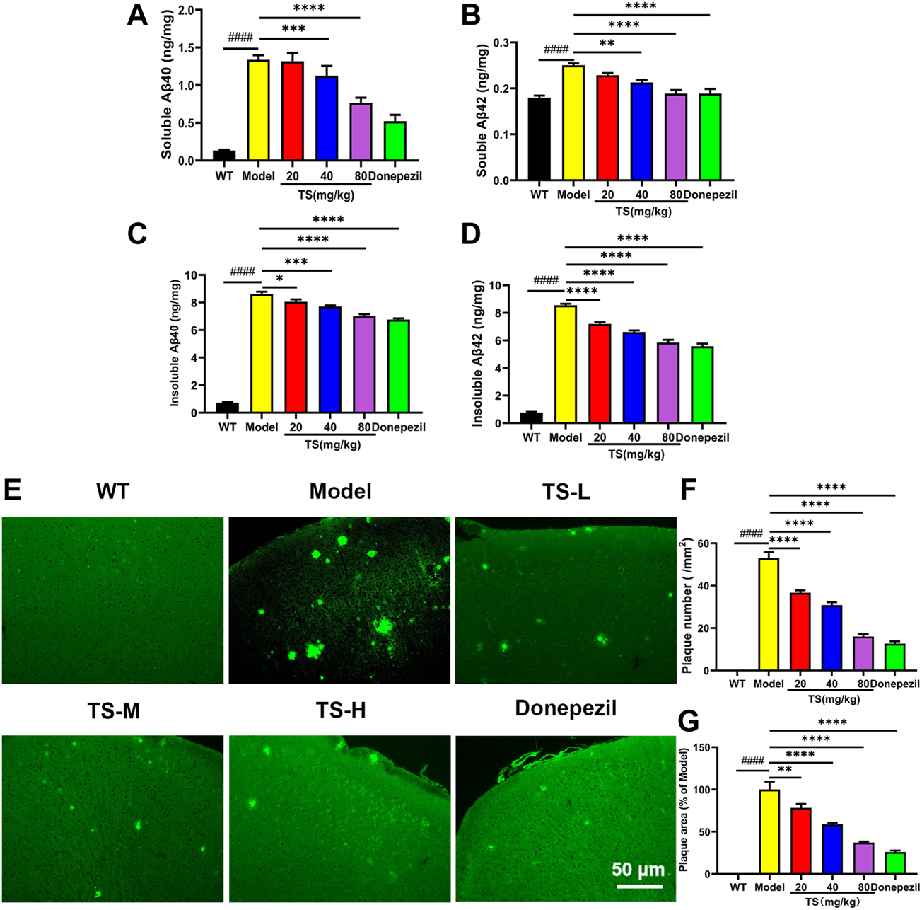 TS treatment decreased the levels of Aβ and senile plaque in the brain of APP/PS1 mice. (A) The effect of TS on the levels of soluble Aβ40 in the brain of APP/PS1 mice was measured by ELISA (####p < 0.0001, ***p = 0.0003, ****p < 0.0001). (B) The effect of TS on the levels of soluble Aβ42 in the brain of APP/PS1 mice was measured by ELISA (####p < 0.0001, **p = 0.0015, ****p < 0.0001). (C) The effect of TS on the levels of insoluble Aβ40 in the brain of APP/PS1 mice was measured by ELISA (####p < 0.0001, *p = 0.0220, ***p = 0.0002, ****p < 0.0001). (D) The effect of TS on the levels of insoluble Aβ42 in the brain of APP/PS1 mice was measured by ELISA (####p < 0.0001, ****p < 0.0001). (E) The effect of TS on the senile plaque in the brain of APP/PS1 mice was investigated by ThS fluorescence. (F) Quantitative analysis of the number of senile plaques in the brain of APP/PS1 mice (####p < 0.0001, ****p < 0.0001). (G) Quantitative analysis of the positive area of senile plaques in the brain of APP/PS1 mice (####p < 0.0001, **p = 0.0069, ****p < 0.0001). #Compared with WT group; *Compared with model group. Data are presented as mean ± SEM (n = 6).
