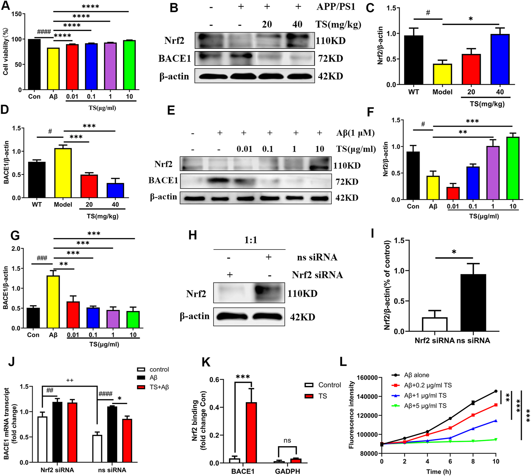 TS treatment promoted Nrf2 to inhibit the expression of BACE1 in the brain of APP/PS1 mice. (A) The effect of TS on the survival rate of Aβ-induced PC12 cells for 24 h was evaluated by MTT assay (####p < 0.0001, ****p < 0.0001). (B) The effect of TS on Nrf2 and BACE1 proteins in the brain of APP/PS1 mice were detected by Western blot. (C) Quantitative analysis of the relative expression level of Nrf2 protein in each group (#p = 0.0195, *p = 0.0151). (D) Quantitative analysis of the relative expression level of BACE1 protein in each group (#p = 0.0343, ***p = 0.0008, ***p = 0.001). (E) The effect of TS on Nrf2 and BACE1 protein in Aβ-induced PC12 cells were detected by Western blot. (F) Quantitative analysis of the relative expression concertation of Nrf2 protein in each group (#p = 0.0119, **p = 0.0027, ***p = 0.0003). (G) Quantitative analysis of the relative expression concertation of BACE1 protein in each group (###p = 0.0003, **p = 0.0016, ***p = 0.0003, ***p = 0.0002, ***p = 0.0001). (H) PC12 cells were transfected with Nrf2-siRNA and transfection reagent at 1:1 for 36h, and the expression of Nrf2 was detected by Western blotting. (I) Quantitative analysis of the relative expression level of Nrf2 protein in Nrf2-siRNA and ns-siRNA groups (*p = 0.0199). (J) The effect of TS on transcription the level of BACE1 in Nrf2−/− PC12 cells was investigated by qPCR (##p = 0.0093, ####p < 0.0001, *p = 0.0234, ++p = 0.0030). (K) The effect of TS on the level of Nrf2 and BACE1 promoter binding was investigated by CHIP experiment (***p = 0.0008). (L) The effect of TS on the level of Aβ aggregation was detected by ThT fluorescence method (**p = 0.0058, ***p = 0.0003, ***p = 0.0002). #: Comparing with WT group; *: Compared with model group; +: Compared with ns siRNA group. Data are presented as mean ± SEM (n = 3).