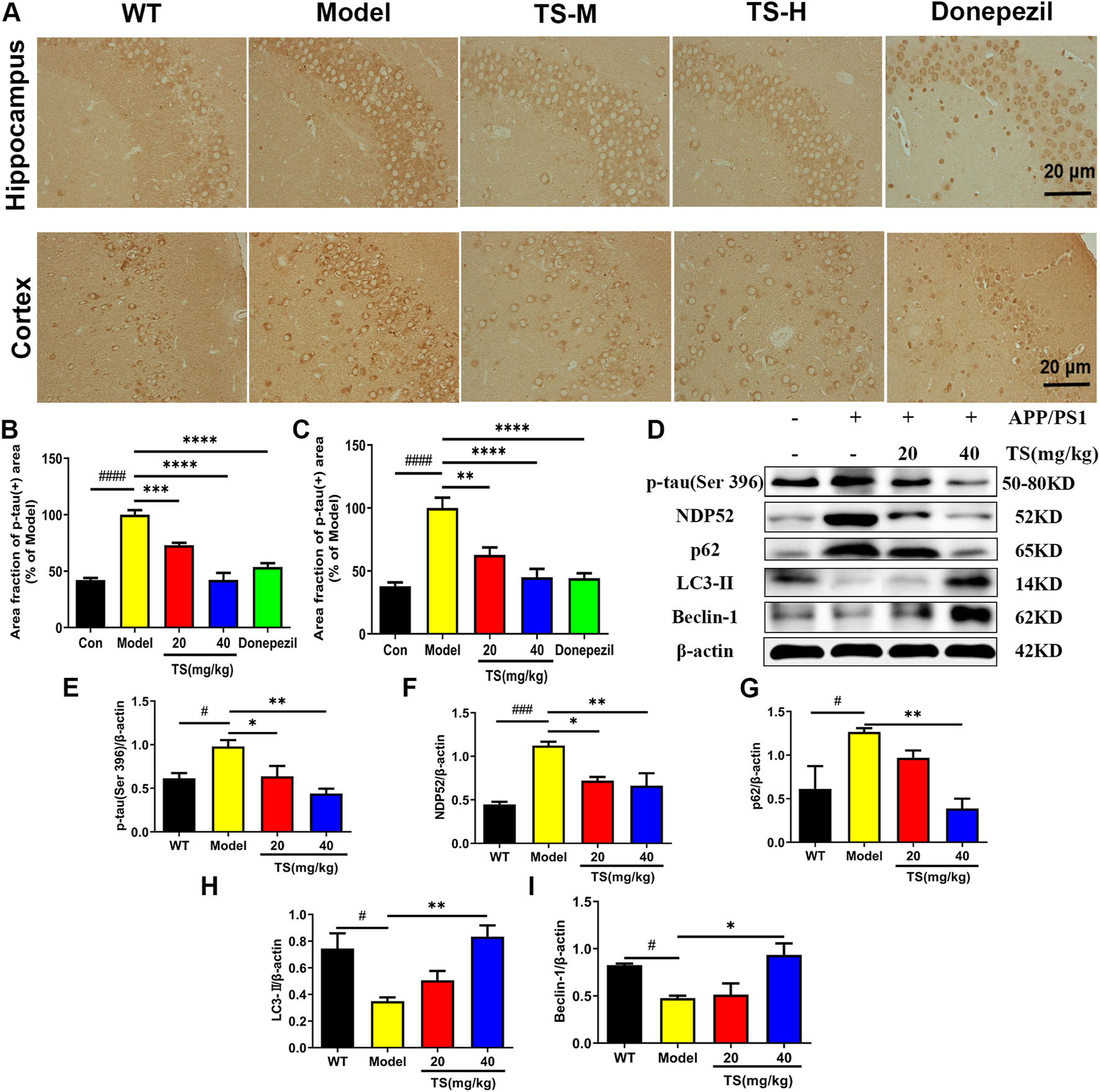 Effects of TS on expressions of p-tau, NDP52, p62 and LC3-II proteins in APP/PS1 mice. (A) The effect of TS on p-tau (ser396) in hippocampus and cortex of APP/PS1 mice was investigated by immunohistochemistry. (B) Quantitative analysis of the percentage of p-tau (Ser396) positive area in the hippocampus of APP/PS1 mice (####p < 0.0001, ***p = 0.0007, ****p < 0.0001). (C) Quantitative analysis of the percentage of p-tau (Ser396) positive area in the cortex of APP/PS1 mice (####p < 0.0001, **p = 0.0016, ****p < 0.0001). (D) The effects of TS on expressions of p-tau (Ser 396), NDP52, p62 and LC3-II proteins in the brain of APP/PS1 mice were detected by Western blot. (E) Quantitative analysis of the relative expression level of p-tau (Ser 396) protein in each group (#p = 0.0332, *p = 0.0436, **p = 0.0042). (F) Quantitative analysis of the relative expression level of NDP52 protein in each group (###p = 0.0008, *p = 0.0177, **p = 0.0086). (G) Quantitative analysis of the relative expression level of p62 protein in each group (#p = 0.0379, **p = 0.0086). (H) Quantitative analysis of the relative expression level of LC3-II protein in each group (#p = 0.0216, **p = 0.0073). (I) Quantitative analysis of the relative expression level of Beclin-1 protein in each group (#p = 0.0496, *p = 0.0136). #Compared with WT group; *Compared with model group. Data are presented as mean ± SEM (n = 3).