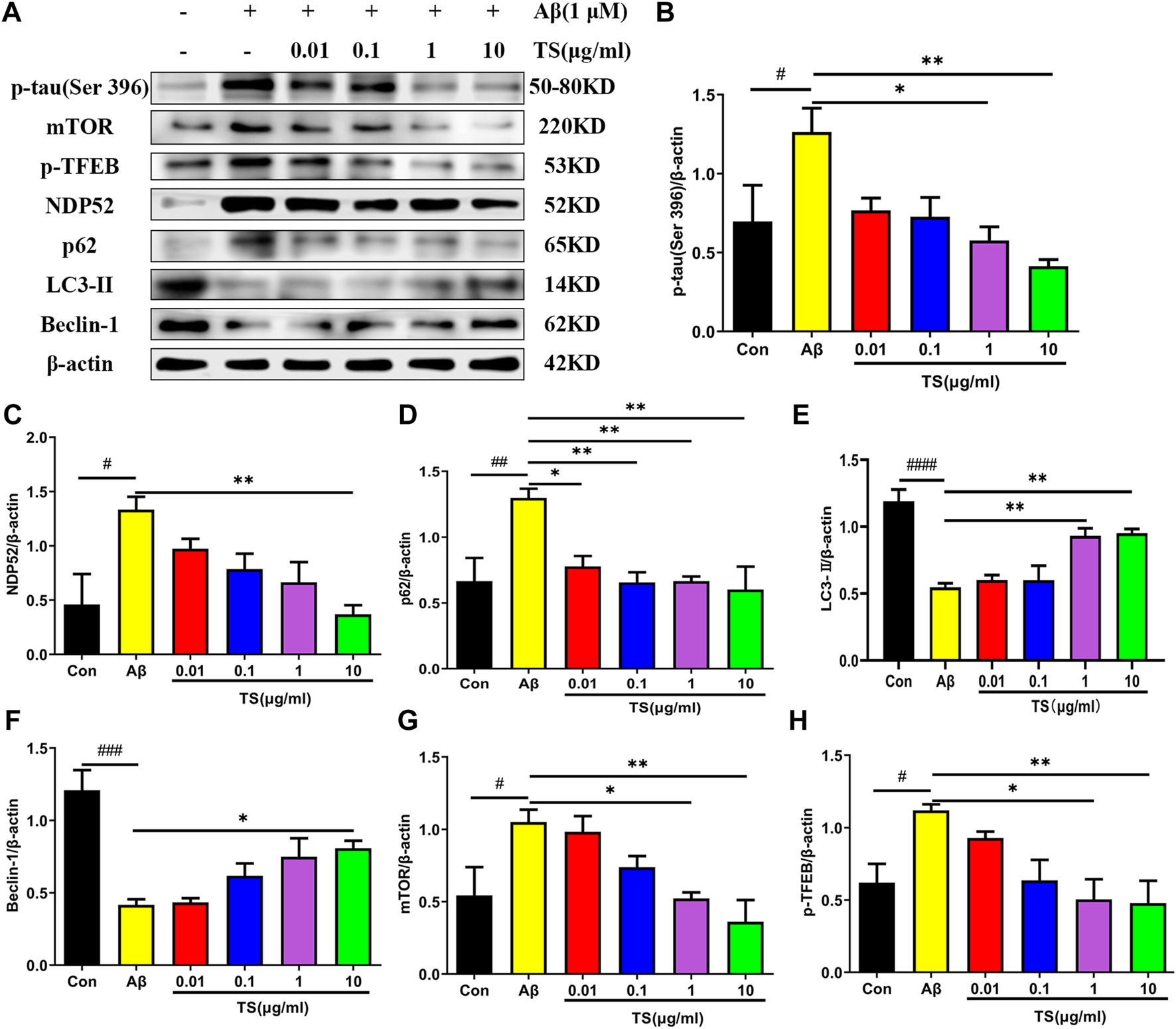 TS treatment promoted autophagy and clear p-tau. (A) The effect of TS on p-tau (Ser 396), NDP52, p62 and LC3-II and Beclin-1 proteins in the Aβ-induced PC12 cells were detected by Western blot. (B) Quantitative analysis of the relative expression concertation of p-tau (Ser 396) protein in each group (#p = 0.0409, *p = 0.0130, **p = 0.0029). (C) Quantitative analysis of the relative expression concertation of NDP52 protein in each group (#p = 0.0113, **p = 0.0057). (D) Quantitative analysis of the gray value of p62 protein bands in each group (##p = 0.0093, *p = 0.0312, **p = 0.0084, **p = 0.0093, **p = 0.0047). (E) Quantitative analysis of the relative expression concertation of LC3-II protein in each group (####p < 0.0001, **p = 0.0053, **p = 0.0037). (F) Quantitative analysis of the relative expression concertation of Beclin-1 protein in each group (###p = 0.0002, *p = 0.0356). (G) Quantitative analysis of the relative expression level of mTOR protein in each group (#p = 0.0450, *p = 0.0359, **p = 0.0068). (H) Quantitative analysis of the relative expression level of p-TFEB protein in each group (#p = 0.0435, *p = 0.0129, **p = 0.0099). #Compared with WT group; *Compared with model group. Data are presented as mean ± SEM (n = 3).